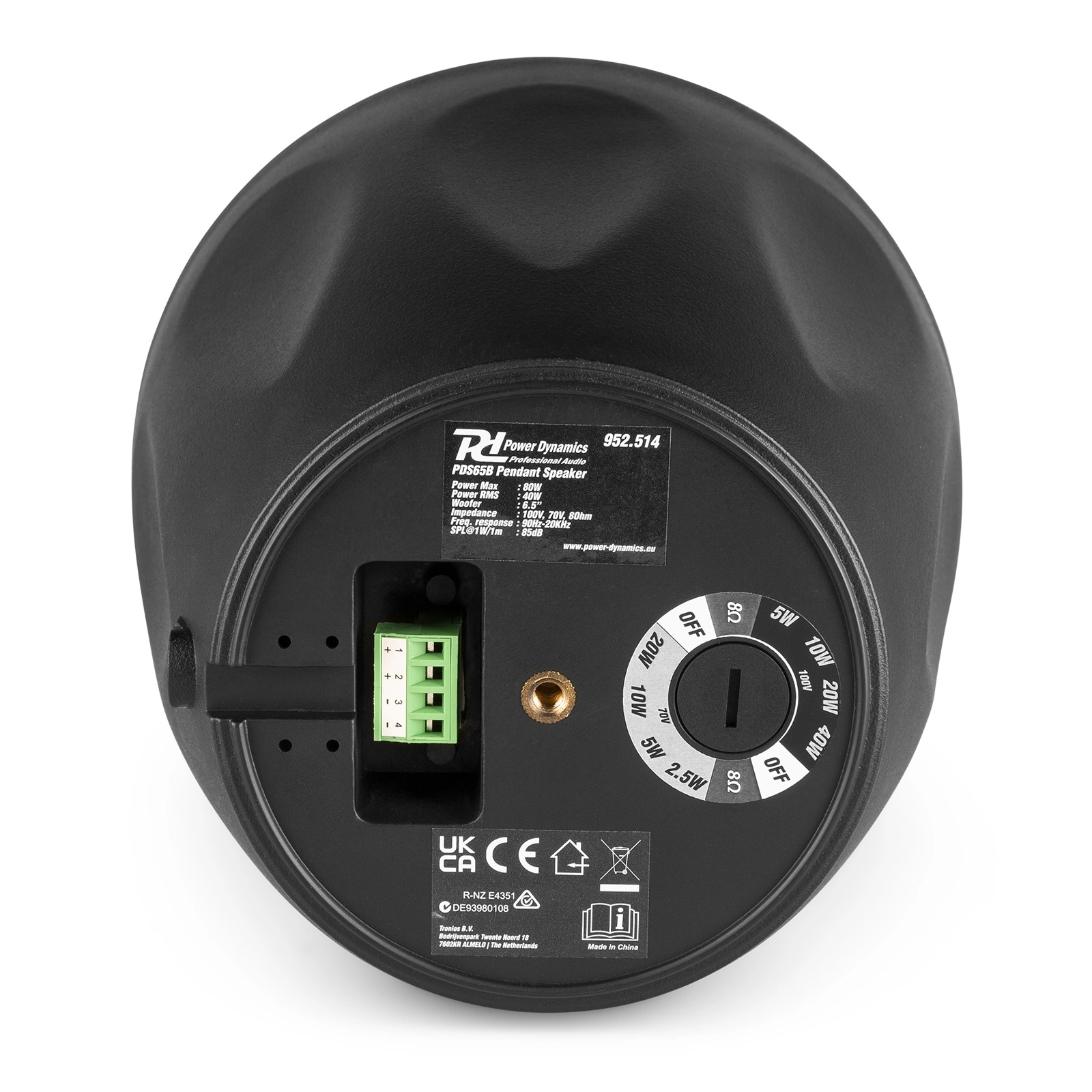 Głośnik ma moc 80W i posiada wiele odczepów zasilania do wykorzystania w instalacji 100V. Odczepy mocy lub opcję 8 omów można łatwo ustawić za pomocą przełącznika obrotowego z tyłu.