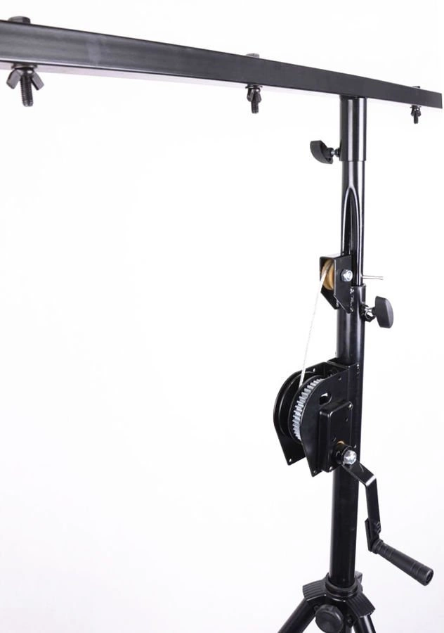 Statyw należy do grupy statywów profesjonalnych, charakteryzujących się wysoką jakością wykonania, dużym przekrojem oraz grubością rur mocujących. Belka poprzeczna umożliwia podwieszenie 4/8 reflektorów lub innych urządzeń oświetleniowych. Zastosowana wyciągarka znacznie ułatwia ustawienie właściwej wysokości montowanego oświetlenia, bez konieczności nadwyrężania ramion - wystarczy kręcić korbką, a statyw będzie się wysuwał lub opuszczał.