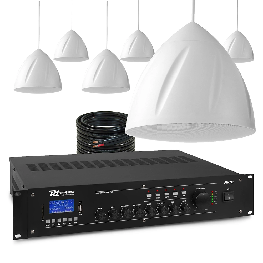 Komercyjny zestaw głośników do montażu na linii 100 V, w zestawie wzmacniacz z mikserem oraz potrzebne do podłączenia okablowaniem. Ten wstępnie skonfigurowany system emisji muzyki w tle jest idealnym rozwiązaniem dla wszystkich komercyjnych zastosowań w miejscach takich jak restauracje, bary, puby, kawiarnie, sklepy, magazyny i biura.