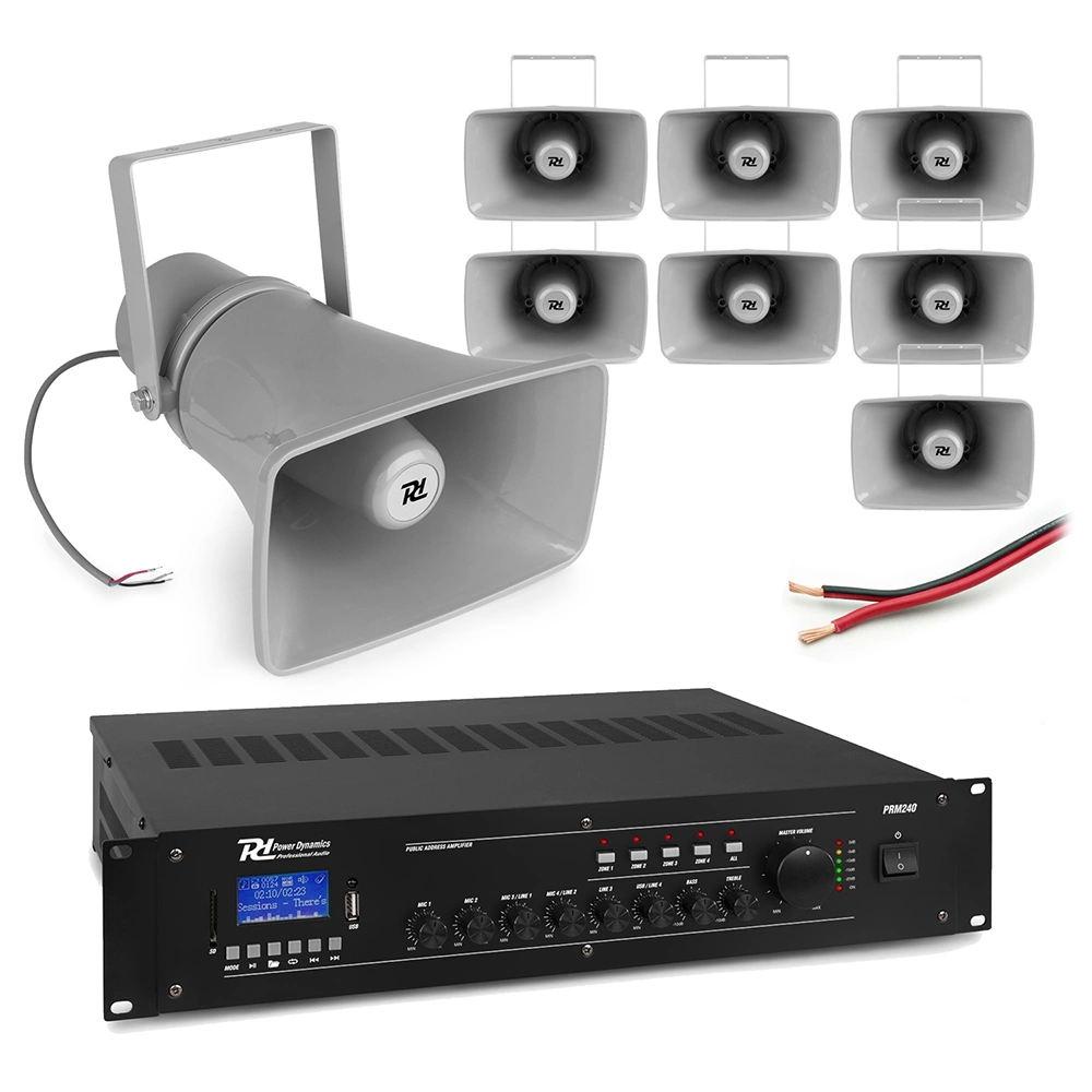 Ten pakiet zawiera odporne na warunki atmosferyczne zewnętrzne głośniki tubowe, które można zamontować na dowolnej płaskiej powierzchni. Wzmacniacz Power Dynamics jest wyposażony w cztery wejścia mikrofonowe, w tym priorytet wokalu i zasilanie phantom dla mikrofonów pojemnościowych. Ponadto posiada wbudowany odtwarzacz MP3 może być używany do odtwarzania wcześniej nagranych wiadomości za pomocą jednego przycisku.