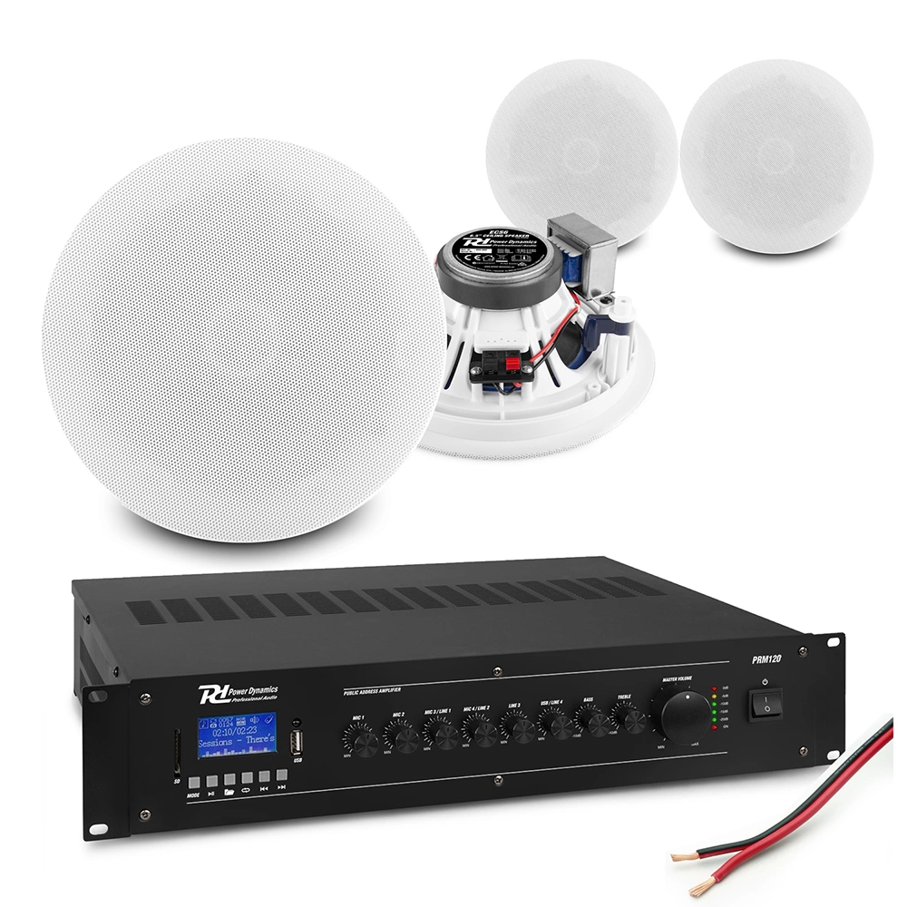 Komercyjny zestaw głośników do montażu na linii 100 V, w zestawie 4-strefowy wzmacniacz z mikserem oraz potrzebne do podłączenia okablowaniem. Ten wstępnie skonfigurowany system emisji muzyki w tle jest idealnym rozwiązaniem dla wszystkich komercyjnych zastosowań w miejscach takich jak restauracje, bary, puby, kawiarnie, sklepy, magazyny i biura.