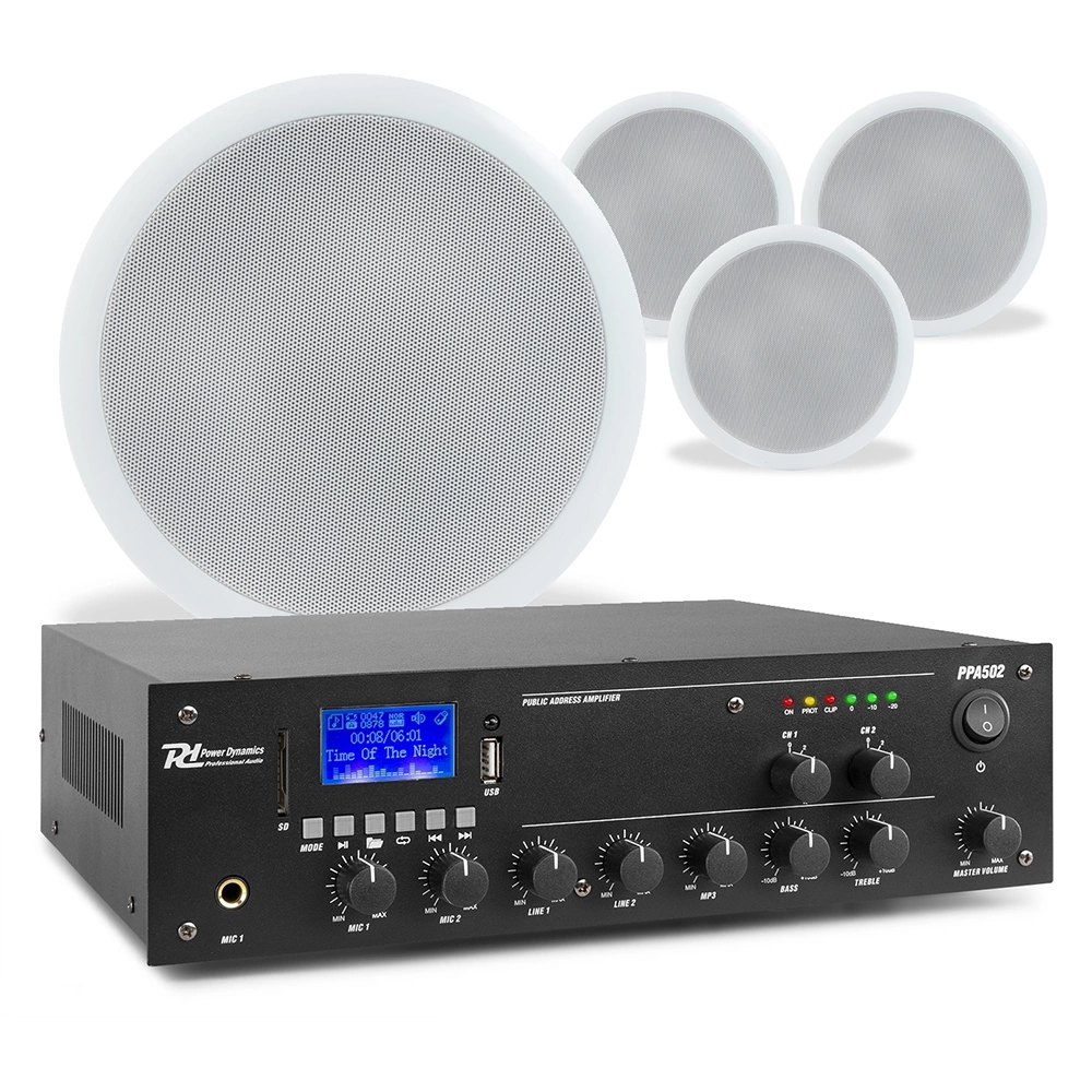Power Dynamics PPA502 to wzmacniacz 100V o mocy 50W. Wzmacniacz posiada 2 strefy, których głośność można regulować niezależnie od siebie. Dzięki temu idealnie nadaje się do niewielkich podkładów muzycznych lub nagłośnienia, np. w sklepach, barach, poczekalniach itp. Wzmacniacz jest wyposażony w Bluetooth do bezprzewodowego przesyłania dźwięku np. z telefonu lub tabletu. W zestawie znajduje się również odtwarzacz MP3. Pilot jest dołączony do odtwarzacza MP3. Wzmacniacz posiada również 2 wejścia liniowe RCA i 2 wejścia mikrofonowe jack (6,3 mm), dzięki temu
