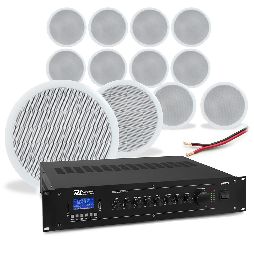 Profesjonalna komercyjna 100V instalacja liniowa z systemem głośników instalacyjnych zawierająca wzmacniacz bluetooth z mikserem oraz potrzebnym do podłączenia okablowaniem. Ten wstępnie skonfigurowany system emisji muzyki w tle jest idealnym rozwiązaniem dla wszystkich komercyjnych zastosowań w miejscach takich jak restauracje, bary, puby, kawiarnie, sklepy, magazyny, siłownie i sale fitness