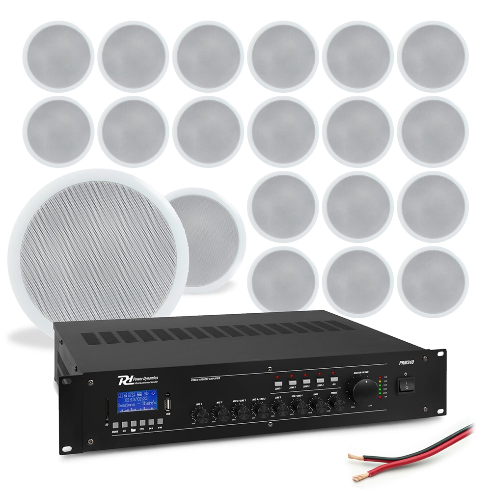 Profesjonalna komercyjna 100V instalacja liniowa z systemem głośników instalacyjnych zawierająca wzmacniacz bluetooth z mikserem oraz potrzebnym do podłączenia okablowaniem. Ten wstępnie skonfigurowany system emisji muzyki w tle jest idealnym rozwiązaniem dla wszystkich komercyjnych zastosowań w miejscach takich jak restauracje, bary, puby, kawiarnie, sklepy, magazyny, siłownie i sale fitness