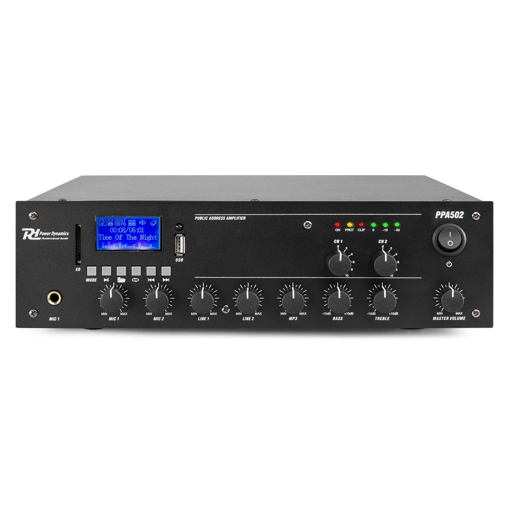 Power Dynamics PPA502 to wzmacniacz 100V o mocy 50W. Wzmacniacz posiada 2 strefy, których głośność można regulować niezależnie od siebie. Dzięki temu idealnie nadaje się do niewielkich podkładów muzycznych lub nagłośnienia, np. w sklepach, barach, poczekalniach itp. Wzmacniacz jest wyposażony w Bluetooth do bezprzewodowego przesyłania dźwięku np. z telefonu lub tabletu. W zestawie znajduje się również odtwarzacz MP3. Pilot jest dołączony do odtwarzacza MP3. Wzmacniacz posiada również 2 wejścia liniowe RCA i 2 wejścia mikrofonowe jack (6,3 mm), dzięki temu PPA502 może być używany zarówno w systemach muzycznych, jak i nagłośnieniowych (lub w połączeniu obu). Możliwe jest podłączenie do drugiego wzmacniacza za pomocą wyjścia liniowego RVC.