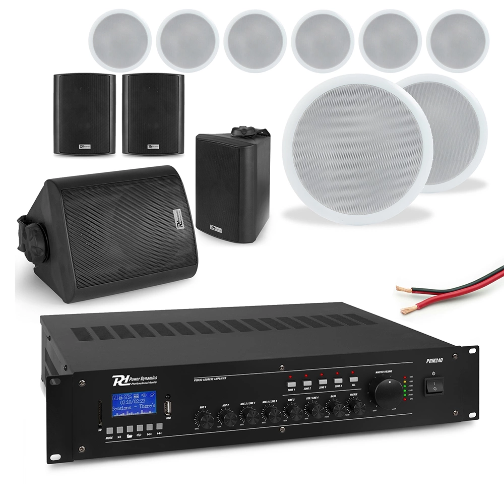 Profesjonalna komercyjna 100V instalacja liniowa z systemem odpornych na warunki pogodowe głośników zawierająca sześciokanałowy wzmacniacz instalacyjny z mikserem oraz potrzebnym do podłączenia okablowaniem. Ten wstępnie skonfigurowany system emisji muzyki w tle jest idealnym rozwiązaniem dla wszystkich komercyjnych zastosowań w miejscach takich jak restauracje, bary, puby, kawiarnie, sklepy, magazyny, siłownie i sale fitness