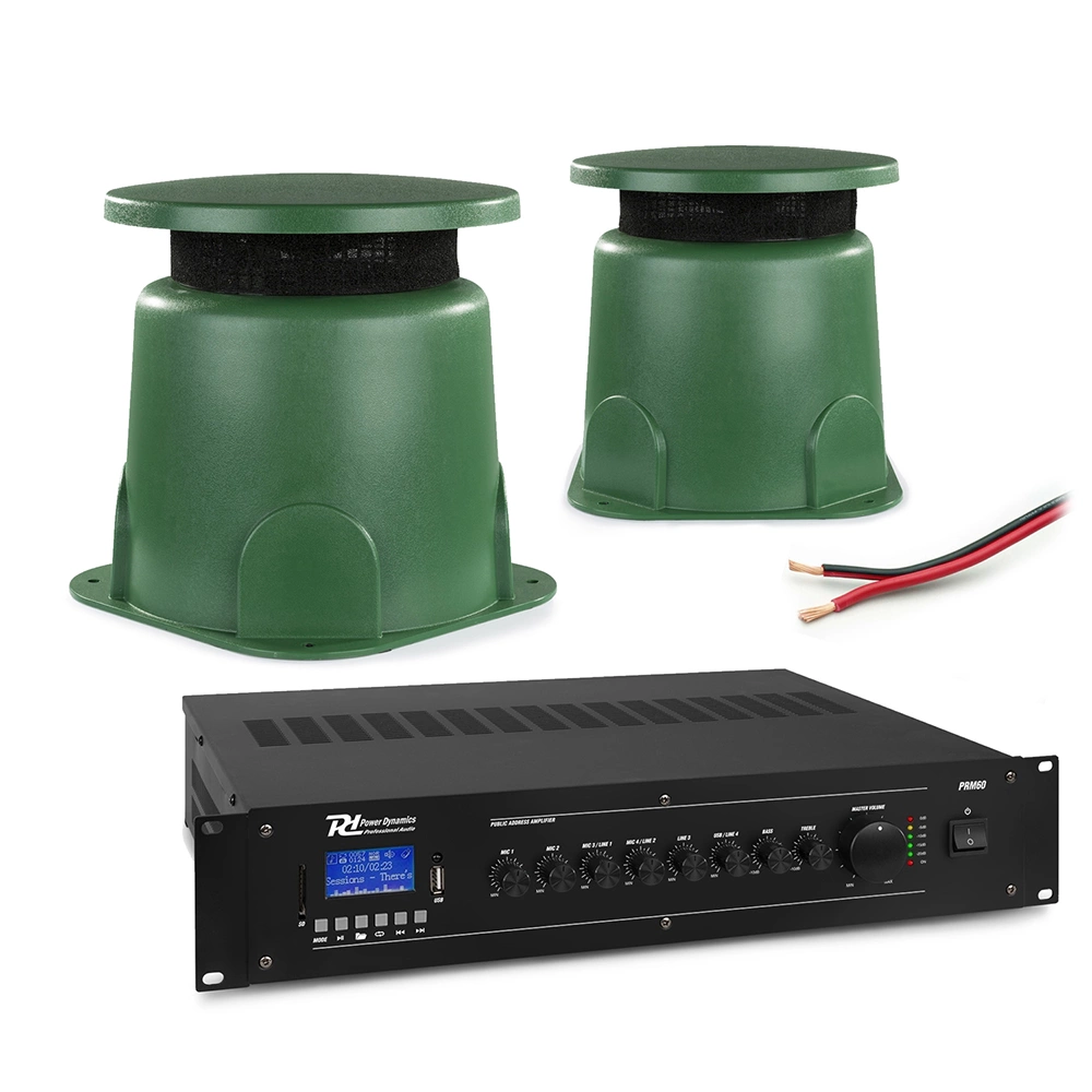 Profesjonalny zewnętrzny system głośników ogrodowych o napięciu 100 V, w tym wzmacniacz Bluetooth i kabel głośnikowy. Ten wstępnie skonfigurowany muzyczny system jest idealnym rozwiązaniem dla wszystkich komercyjnych instalacji zewnętrznych, w tym restauracji, barów, pubów, kawiarni, sklepów, parków rozrywki, centrów rozrywki i sklepów