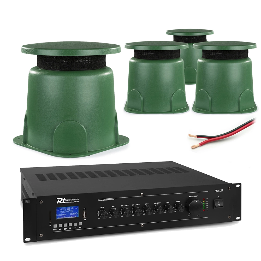 Profesjonalny zewnętrzny system głośników ogrodowych o napięciu 100 V, w tym wzmacniacz Bluetooth i kabel głośnikowy. Ten wstępnie skonfigurowany muzyczny system jest idealnym rozwiązaniem dla wszystkich komercyjnych instalacji zewnętrznych, w tym restauracji, barów, pubów, kawiarni, sklepów, parków rozrywki, centrów rozrywki i sklepów