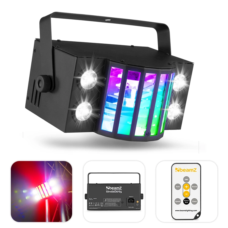 StrobeDerby to połączenie spektakularnego efektu Derby z czterema białymi wiązkami LED o dużej mocy. Te białe diody LED mogą być również używane jako stroboskop do wytwarzania dodatkowej energii w pomieszczeniu. Ten efekt zapewnia małym klubom i mobilnym artystom wygodę korzystania z wielu efektów w jednym pokazie świetlnym bez konieczności transportu wielu urządzeń.