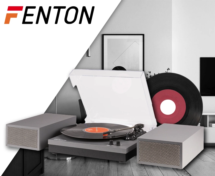 Gramofon Fenton RP165G łączy w sobie najczęściej stosowane obecnie sposoby słuchania muzyki. RP165G to gramofon z Bluetooth w obudowie retro, który zapewnia wspaniałe, nostalgiczne uczucie towarzyszące odtwarzaniu płyt. System jest wyposażony w dwa głośniki w tym samym stylu.