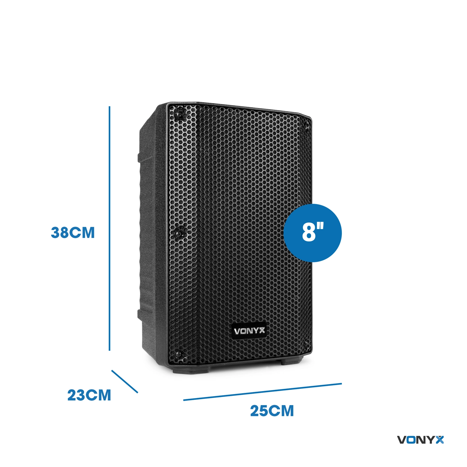 Vonyx VSA08BT to aktywna kolumna z plastikową obudową ABS. Wyposażona jest we wbudowany wzmacniacz z przełączanym wejściem liniowym/mikrofonowym + Bluetooth oraz odtwarzacz MP3. Wyjście liniowe umożliwia łatwe przeniesienie sygnału do drugiej kolumny. Dzięki temu VSA08BT można łatwo wykorzystać do takich zastosowań, jak przyjęcie w domu, przemówienie lub demonstracja, ale można również zapewnić oprawę muzyczną, śpiew lub mowę na większym wydarzeniu.