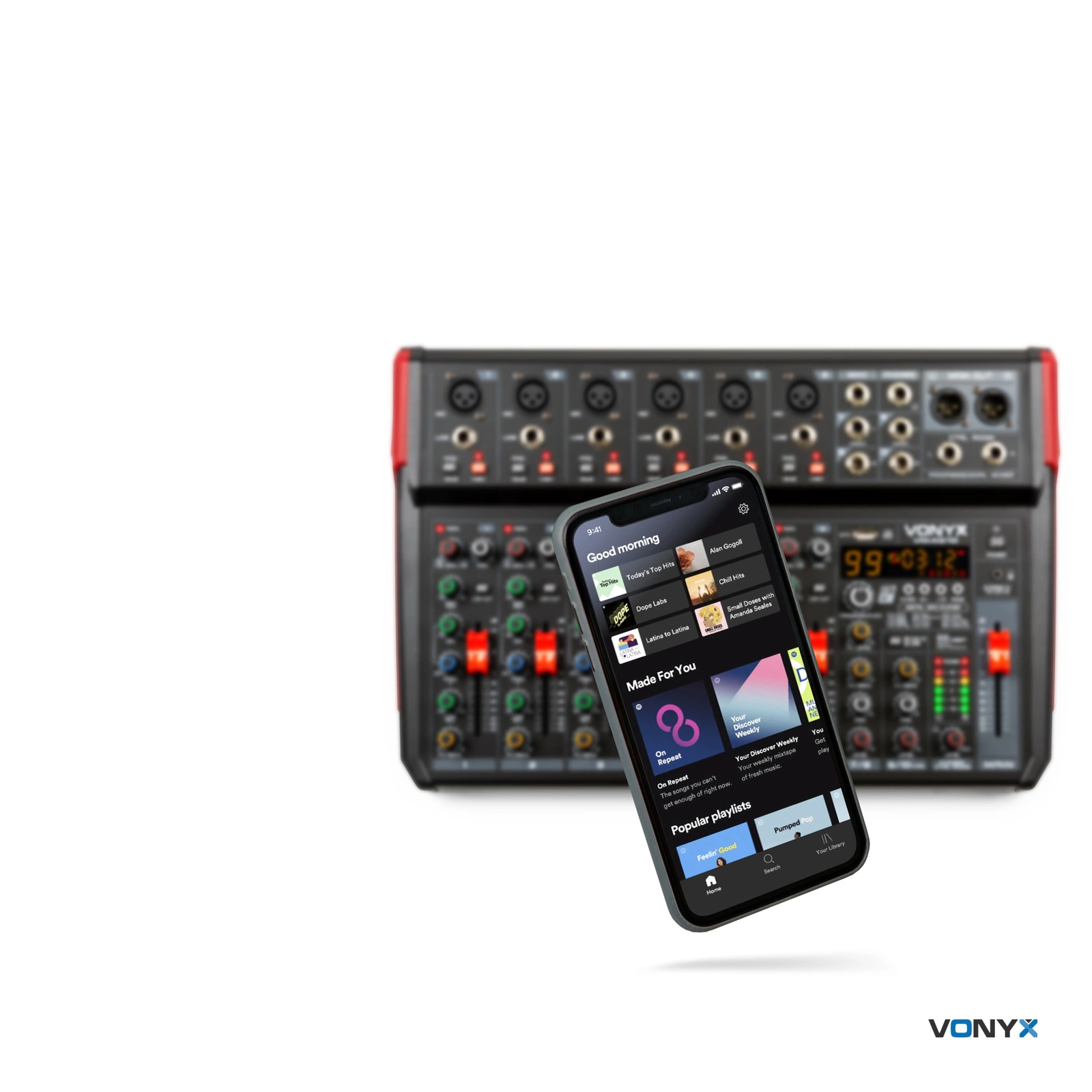 Podcasty z kilkoma osobami, muzyka na żywo (instrumenty i mikrofony) i/lub wokale (chóry), nagrania studyjne itp. to tylko kilka przykładów zastosowań tej konsoli mikserskiej. Konsola miksująca zawiera Bluetooth, odtwarzacz MP3, procesor DSP z 99 efektami, interfejs audio USB, zasilanie fantomowe, regulację barwy dźwięku (kanały od 1 do 6), 8 kanałów mono, z których 2 mogą być również używane w trybie stereo i tak dalej. Mnóstwo opcji dla całej Twojej muzycznej kreatywności. Ponieważ mikser jest zasilany przez USB, jest również łatwy w obsłudze mobilnej w połączeniu np. z laptopem lub power bankiem.