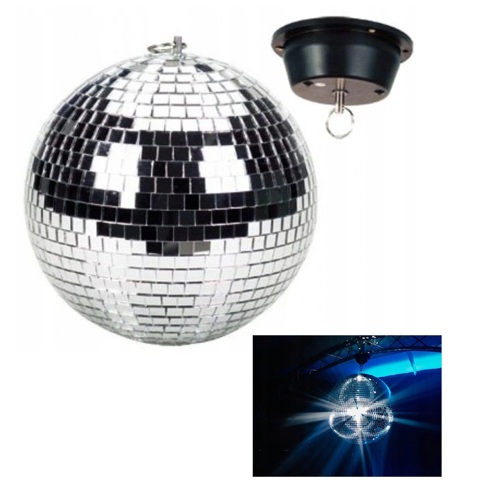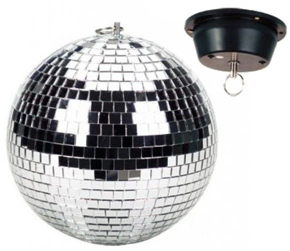z kuli lustrzanej 20 cm (8"), silnika elektrycznego z kablem połączeniowym i 15cm łańcuszka do połączenia tych dwóch elementów. Po prostu połącz z reflektorem i impreza może się rozpocząć.