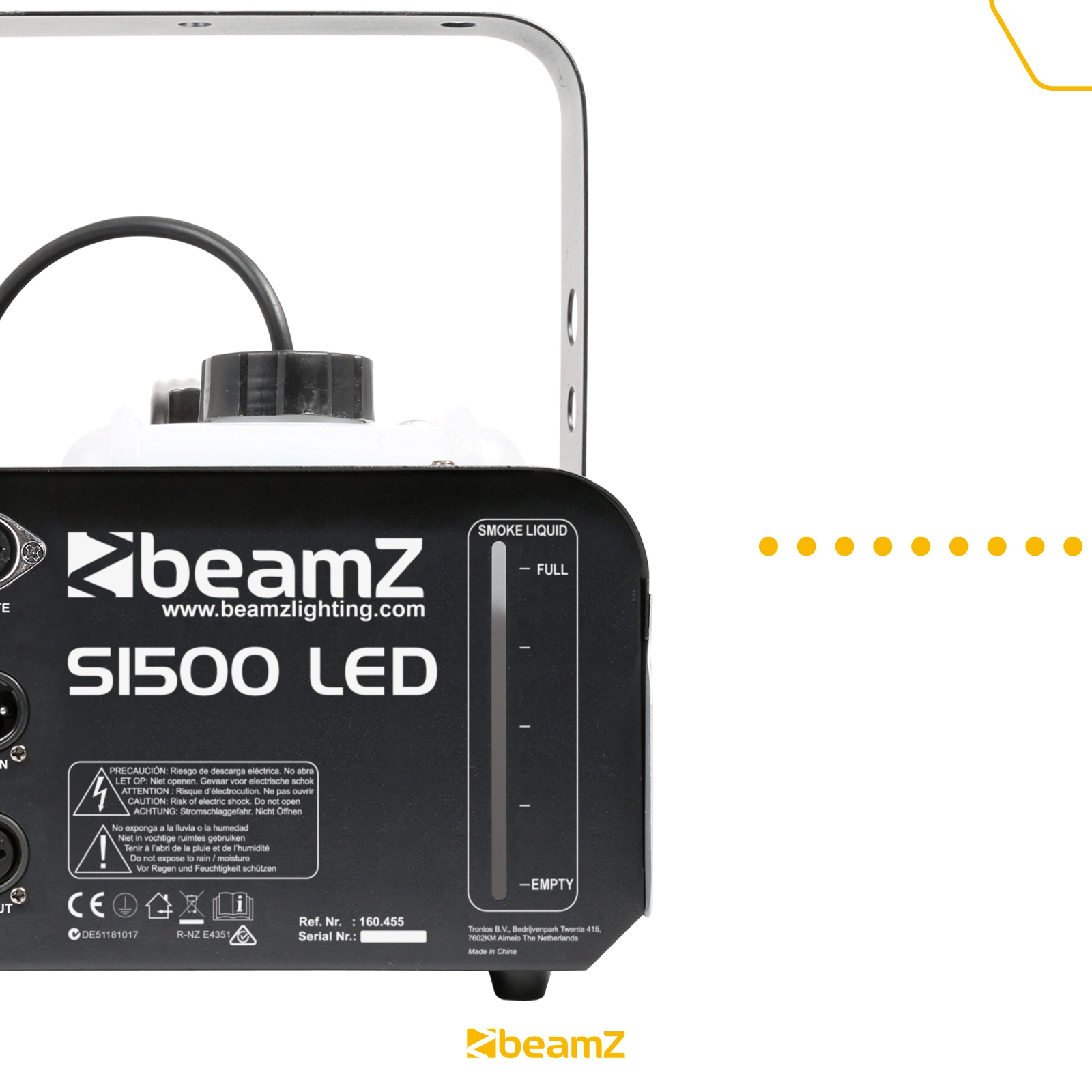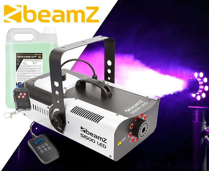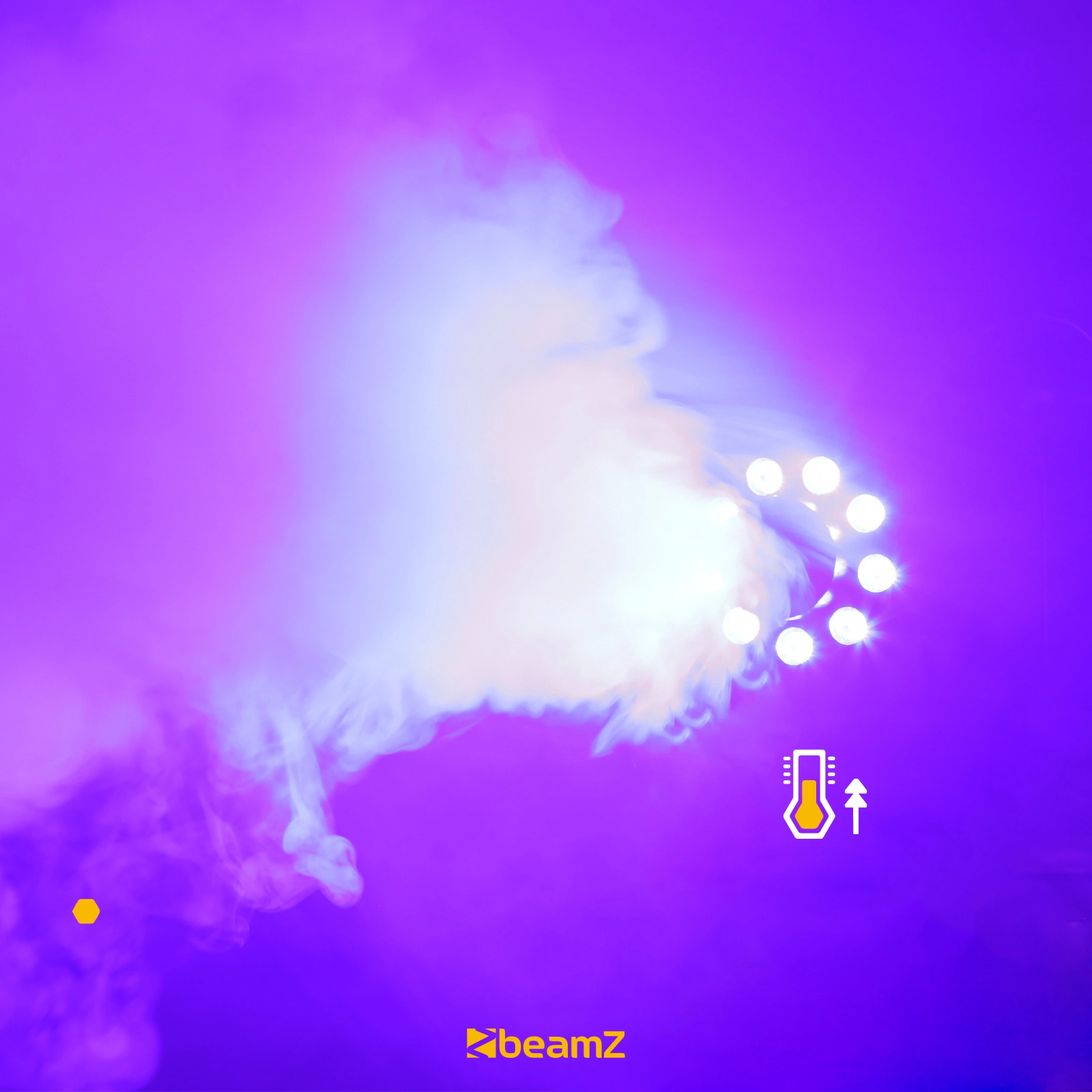 Wytwornica dymu BeamZ S1500LED z 9 diodami LED RGB 3W to wspaniałe połączenie dymu i światła. Dzięki diodom LED umieszczonym bezpośrednio obok dyszy, dym jest natychmiast zabarwiony, aby uzyskać efekt, który zachwyci każdego. Można stworzyć lodowatą atmosferę, oświetlając dym na niebiesko. Zastosowane do tego diody LED to diody RGB, co oznacza, że mogą świecić na czerwono, zielono i niebiesko. Mieszając te kolory, można stworzyć inne kolory, takie jak żółty lub fioletowy. Umożliwia to wiele kolorów, dzięki czemu maszyna do dymu jest prawdziwą perełką pokazu świetlnego. Dzięki dużej mocy 3W na diodę LED uzyskuje się ogromną moc świetlną, dzięki czemu dym jest dobrze oświetlony również na odległość.