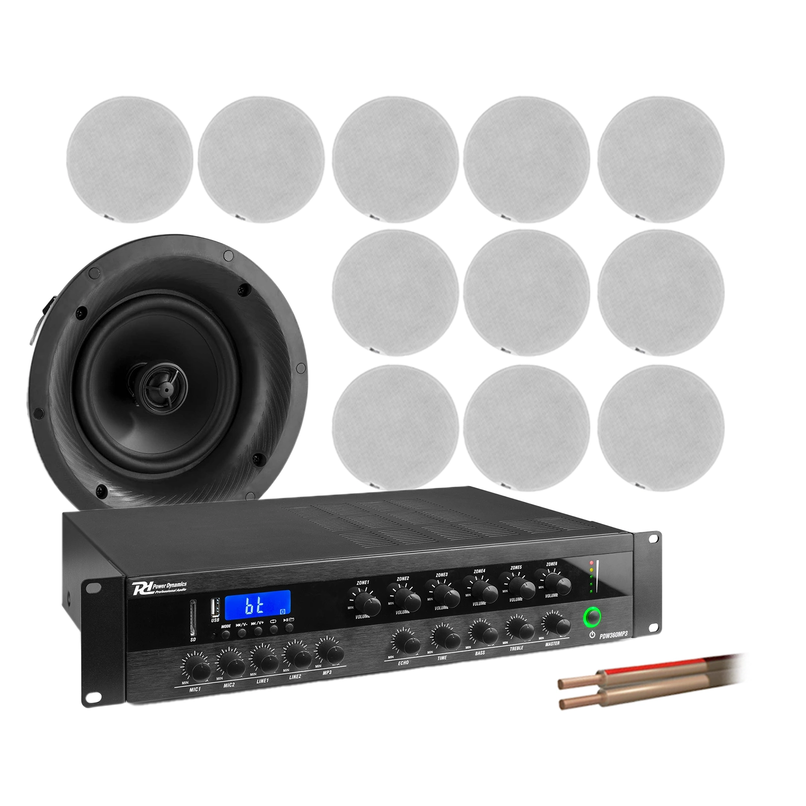 Profesjonalny, komercyjny system głośników sufitowych do instalacji liniowej 100 V, w tym 6 strefowy wzmacniacz miksujący bluetooth i kabel głośnikowy. Ten wstępnie skonfigurowany system PA z muzyką w tle jest idealnym rozwiązaniem dla wszystkich instalacji komercyjnych, w tym restauracji, barów, pubów, kawiarni, sklepów, magazynów i biur, salonów urody czy siłowni lub klubów fitness