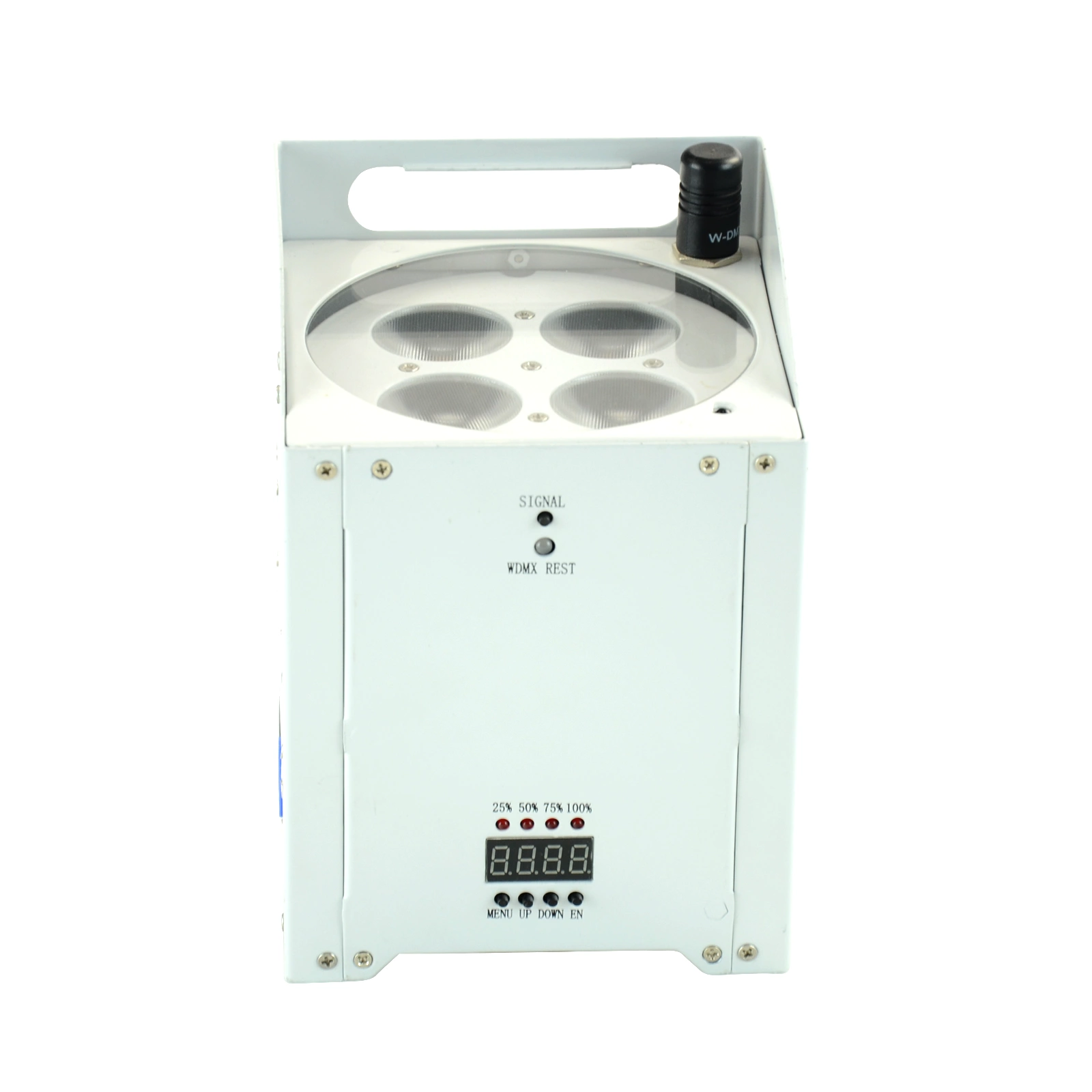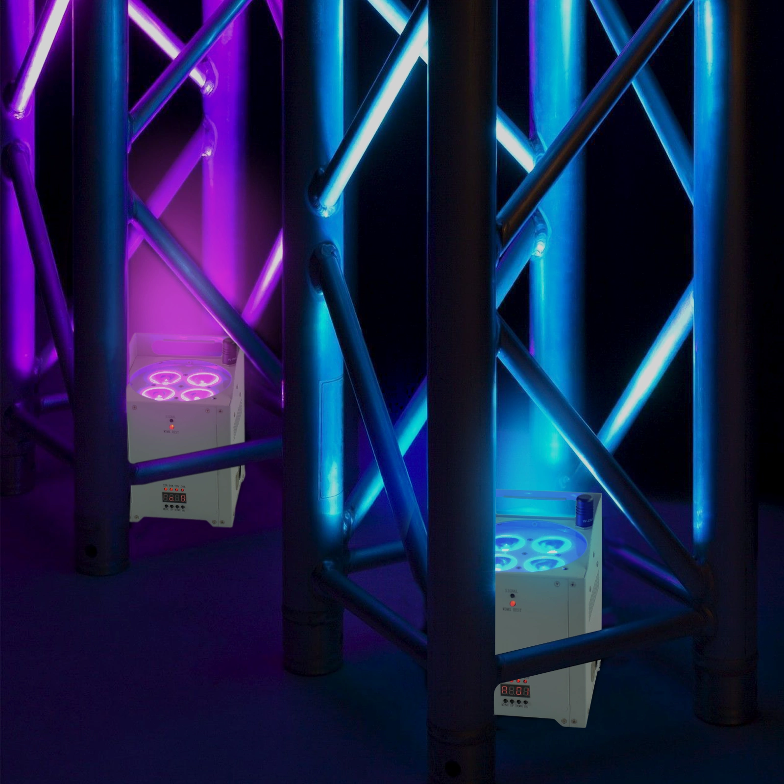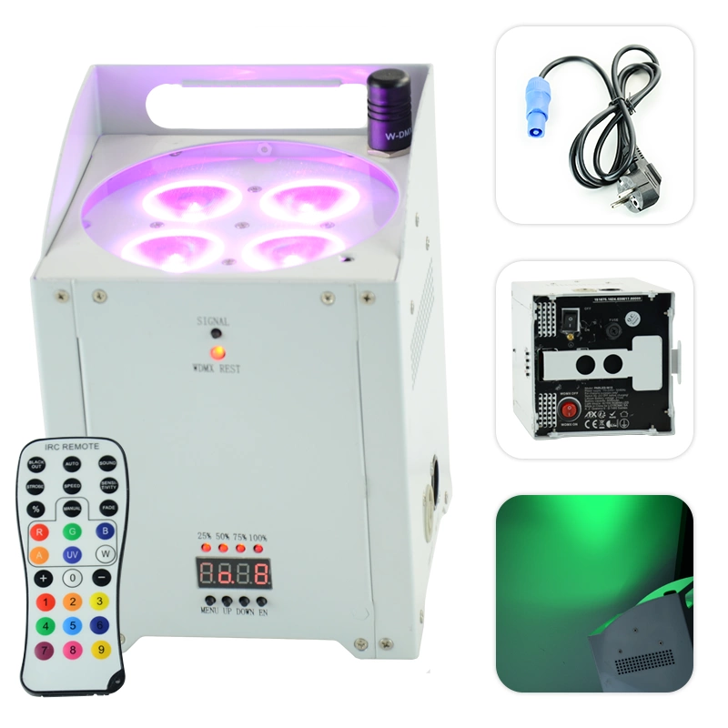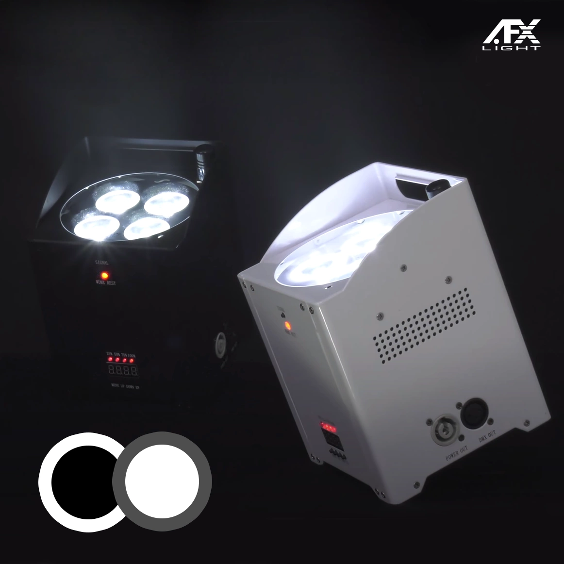 To profesjonalny bezprzewodowy reflektor od marki AFX Light. Wyposażony w akumulator o mocy 8 Ah zapewnia aż do 12 godzin pracy. Urządzenie umożliwia do wykorzystania oprócz standardowego RGB (czerwony, zielony, niebieski) także kolory amber (bursztynowy)oraz biały. Oświetlacz bateryjny posiada wbudowany odbiornik bezprzewodowy DMX. Reflektor ma zaprogramowane automatyczne programy oraz możliwość sterowania dźwiękiem lub kontrolerem DMX. Do urządzenia dołączony jest pilot na podczerwień do zdalnego sterowania.