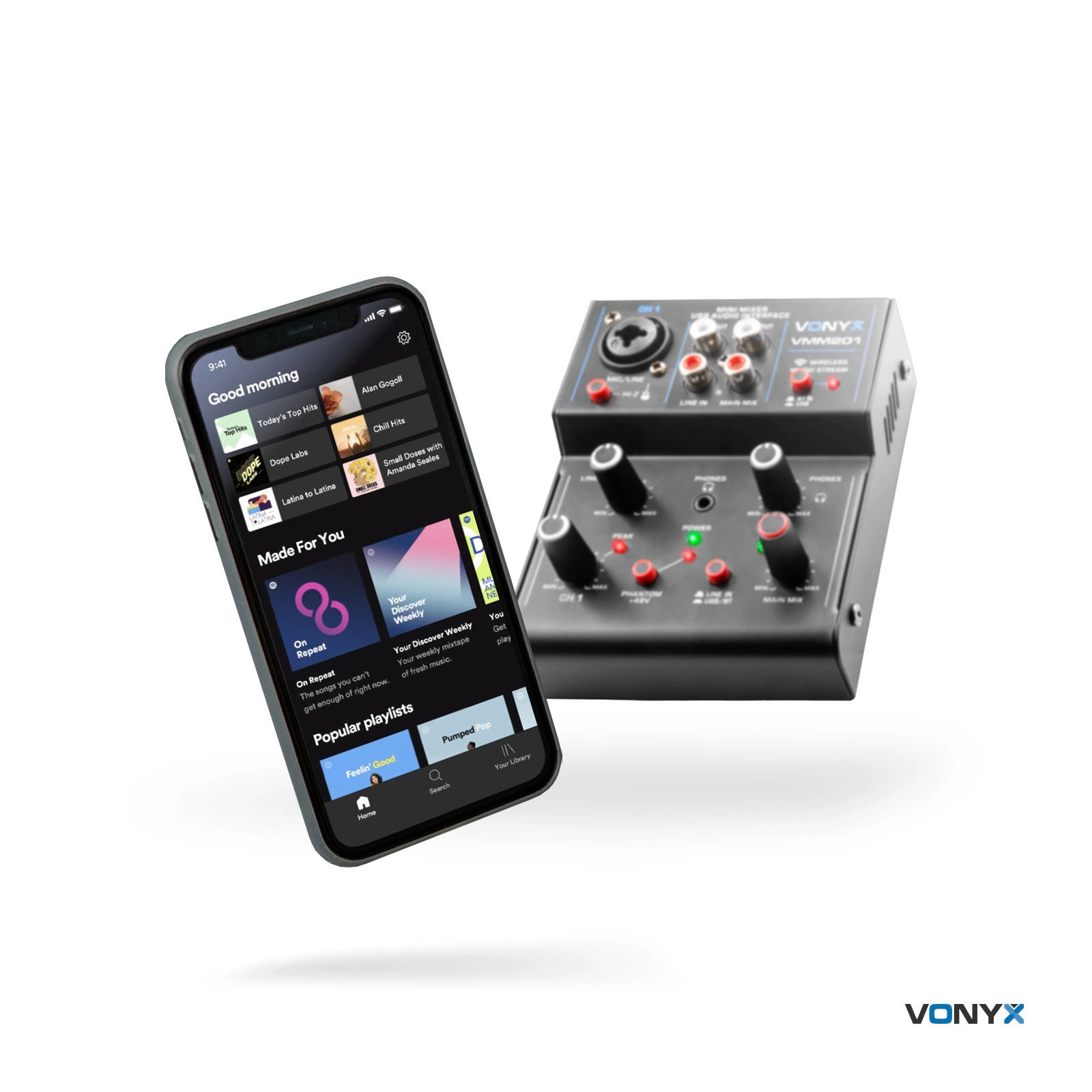Jeśli chcesz stworzyć domowe studio wokalne, oczywiście ważne jest, aby mieć muzykę. VMM201 posiada Bluetooth, dzięki któremu możesz bezprzewodowo przesyłać muzykę np. ze smartfona do miksera. W ten sposób możesz łatwo i szybko śpiewać swoją ulubioną piosenkę, nagrywając ją na przykład na laptopie lub komputerze.