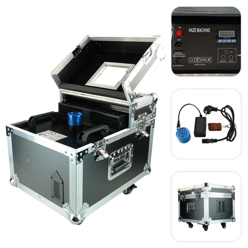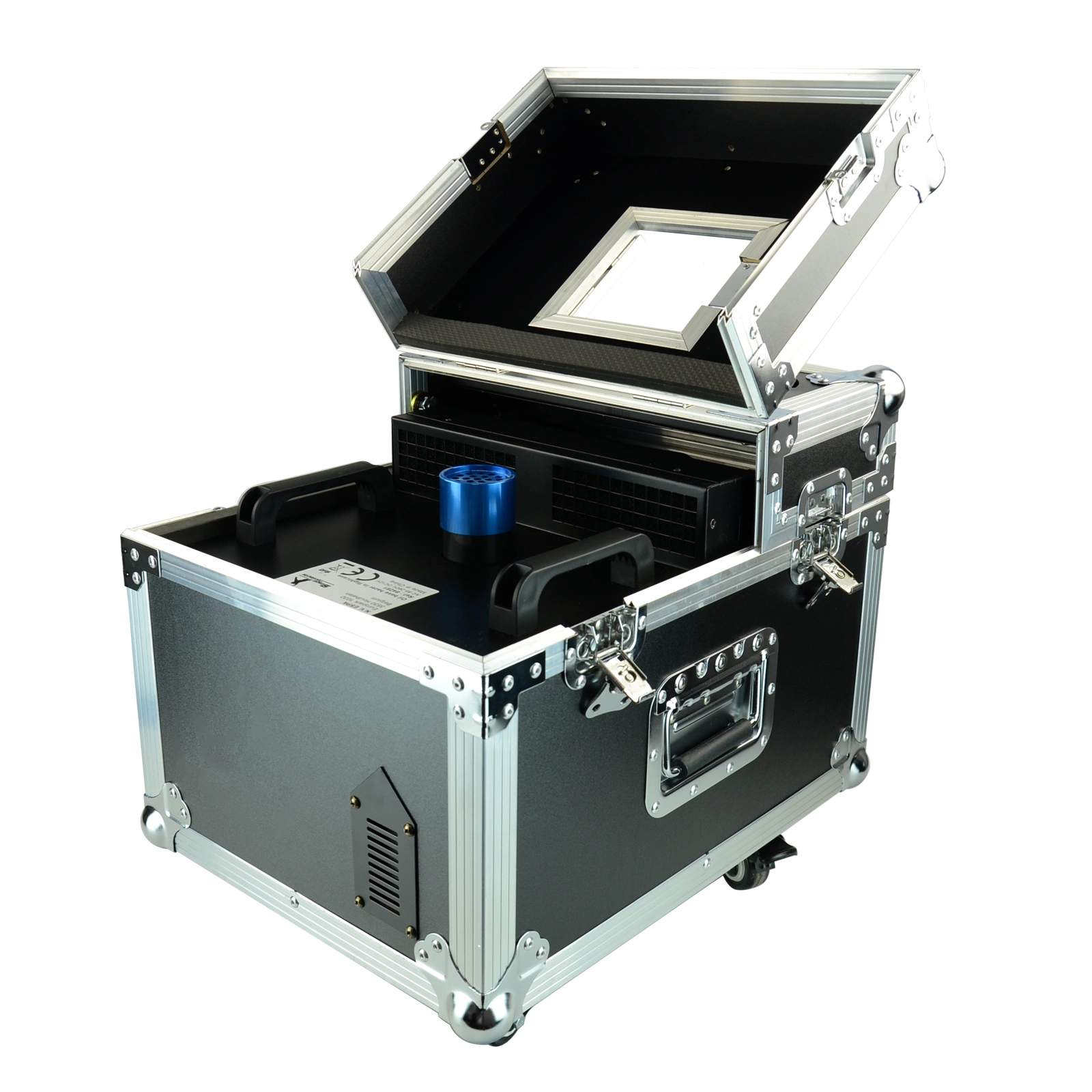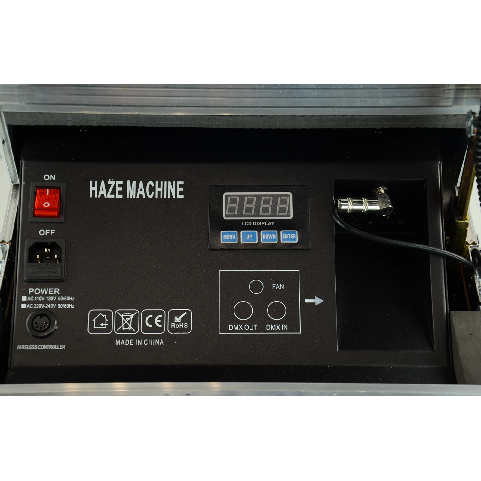 Profesjonalna maszyna do dymu typu Hazer. Wytwornica nie działa ze standardowym płynem do dymu, ale ze specjalnym płynem do na bazie oleju. Ten płyn na bazie oleju tworzy bardzo przyjemną i bardzo delikatną mgiełkę, której prawie nie widać. To sprawia, że Haze jest idealny do teatru lub studia telewizyjnego. Maszyna jest w stanie realizować ciągłą produkcję dymu przez dłuższy okres czasu, dzięki czemu efekty świetlne w pomieszczeniu urzeczywistniają się, a promienie świetlne są optymalnie widoczne. Maszyną można sterować za pomocą DMX, ale można ją również obsługiwać ręcznie lub za pomocą dołączonego bezprzewodowego pilota.