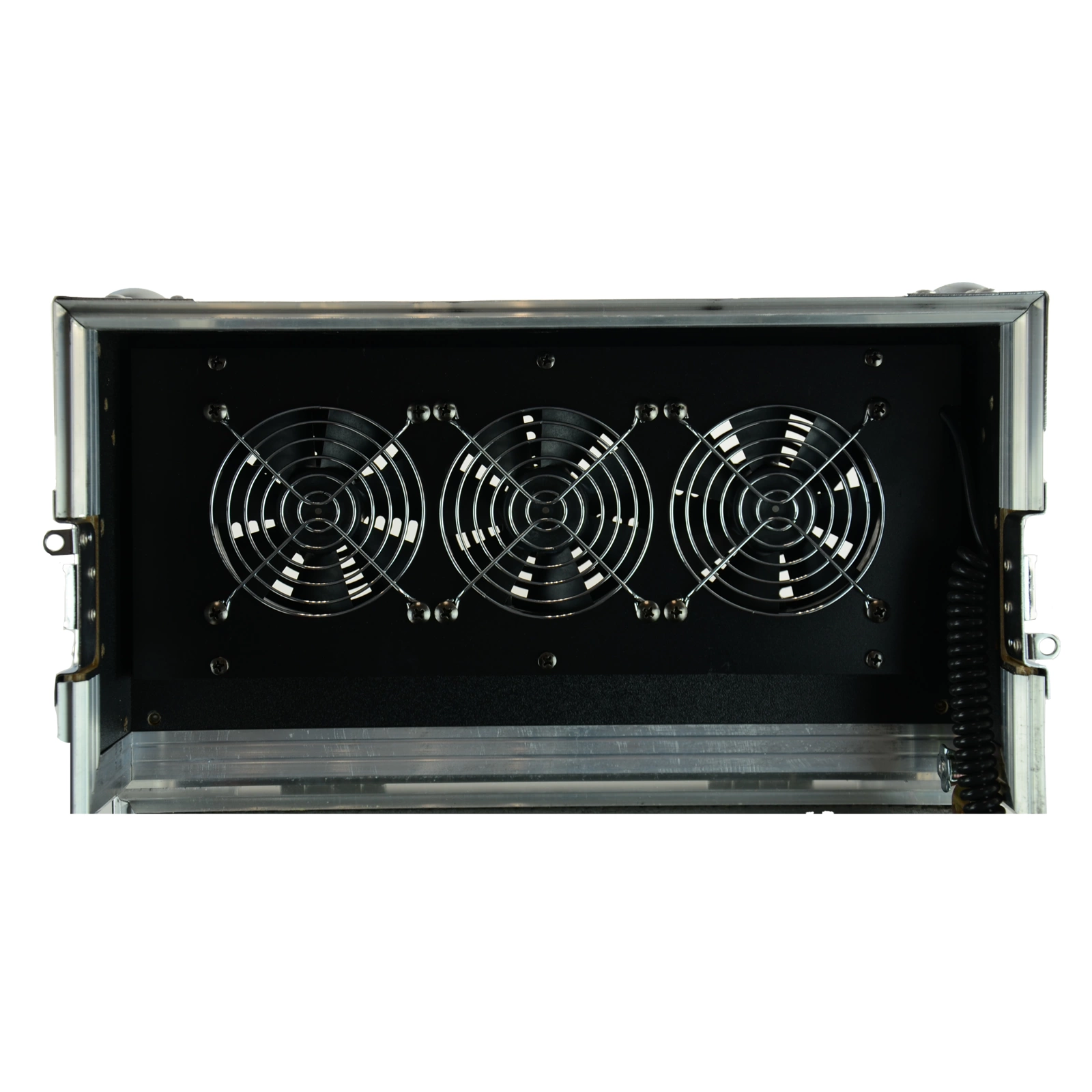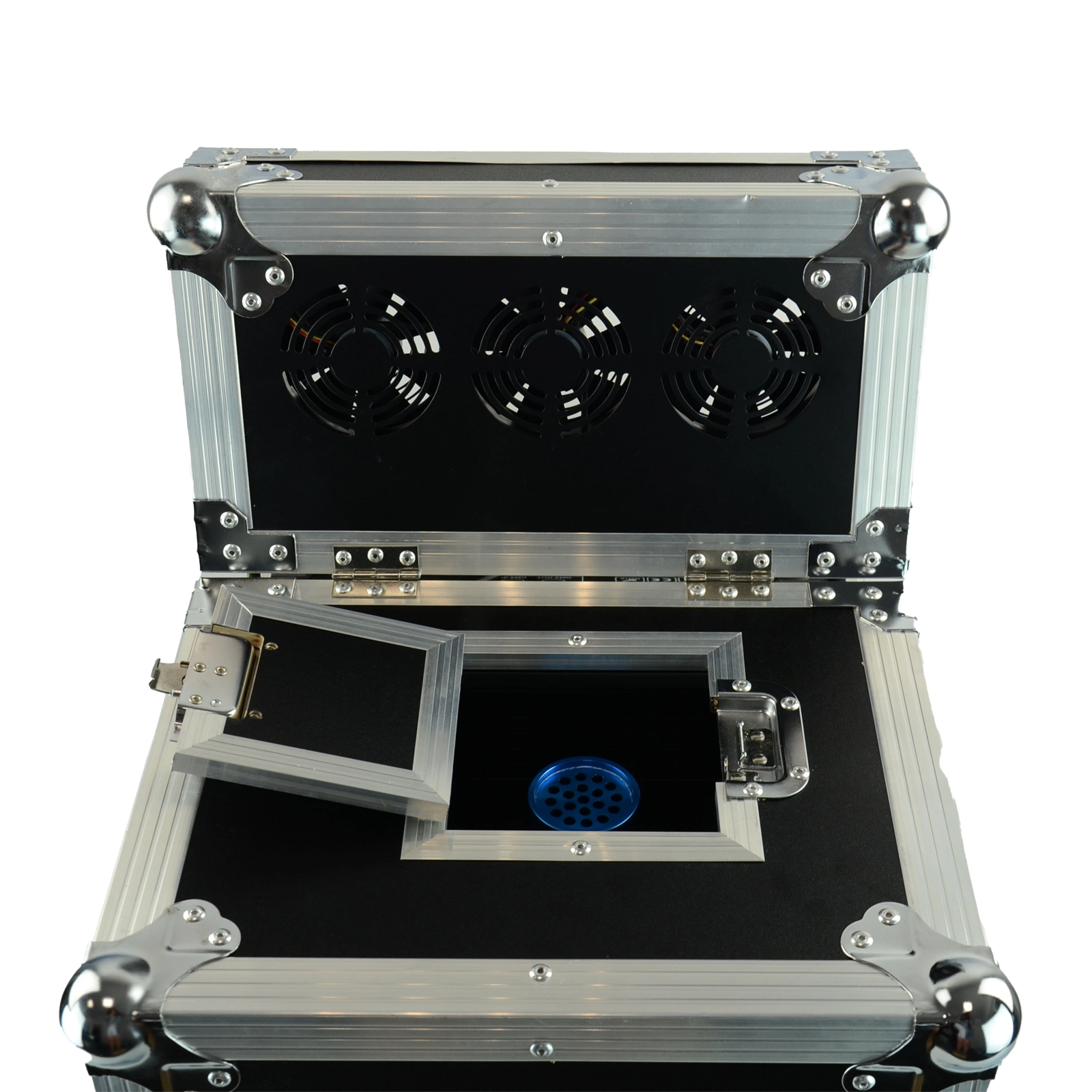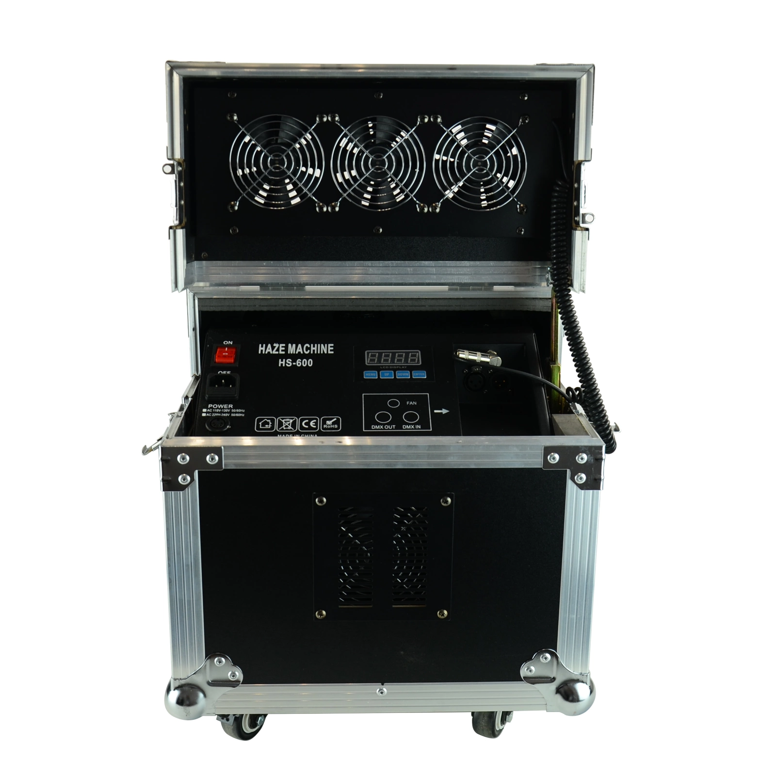 Profesjonalna maszyna do dymu typu Hazer. Wytwornica nie działa ze standardowym płynem do dymu, ale ze specjalnym płynem do na bazie oleju. Ten płyn na bazie oleju tworzy bardzo przyjemną i bardzo delikatną mgiełkę, której prawie nie widać. To sprawia, że Haze jest idealny do teatru lub studia telewizyjnego. Maszyna jest w stanie realizować ciągłą produkcję dymu przez dłuższy okres czasu, dzięki czemu efekty świetlne w pomieszczeniu urzeczywistniają się, a promienie świetlne są optymalnie widoczne. Maszyną można sterować za pomocą DMX, ale można ją również obsługiwać ręcznie lub za pomocą dołączonego bezprzewodowego pilota.