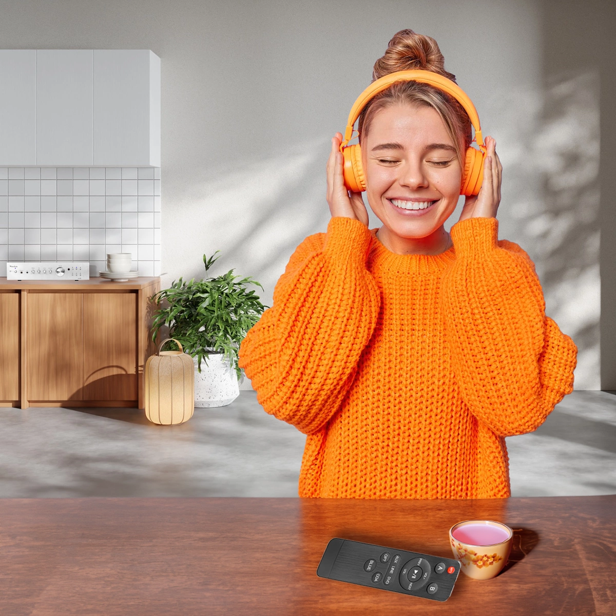 Optymalna swoboda podczas słuchania muzyki. Podłącz swój telefon, tablet, laptop do wzmacniacza przez Bluetooth i strumieniuj muzykę np. z serwisów Spotify czy YouTube całkowicie bezprzewodowo do wzmacniacza. Wzmacniacz jest wyposażony w Bluetooth 5.0 dla najlepszych wrażeń dźwiękowych. Bluetooth 5.0 oferuje również znacznie większy zasięg (do 40 metrów), dzięki czemu nie masz od razu słabnącej muzyki, gdy idziesz na przykład do kuchni. Ponieważ Twoje urządzenie Bluetooth jest niejako pilotem, masz całkowitą kontrolę nad odtwarzaną muzyką.