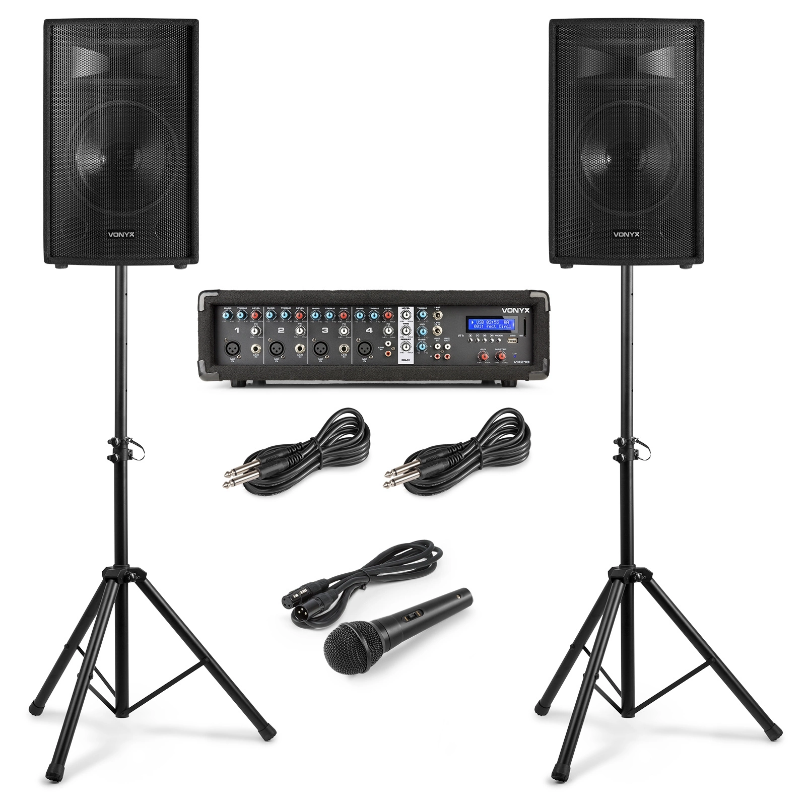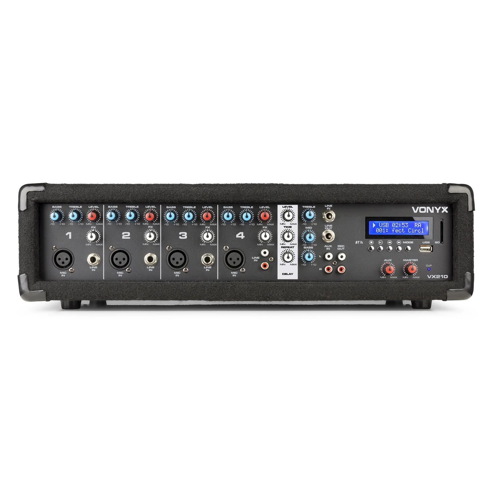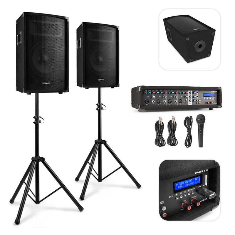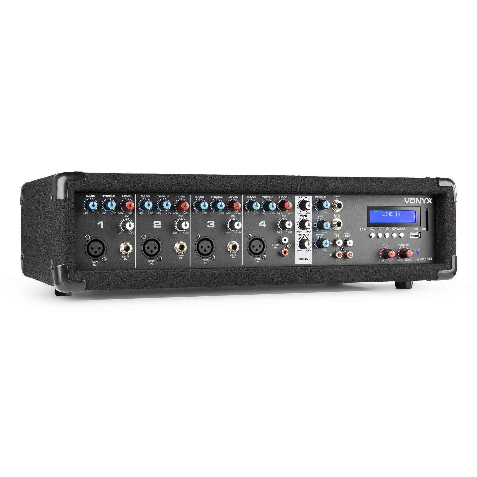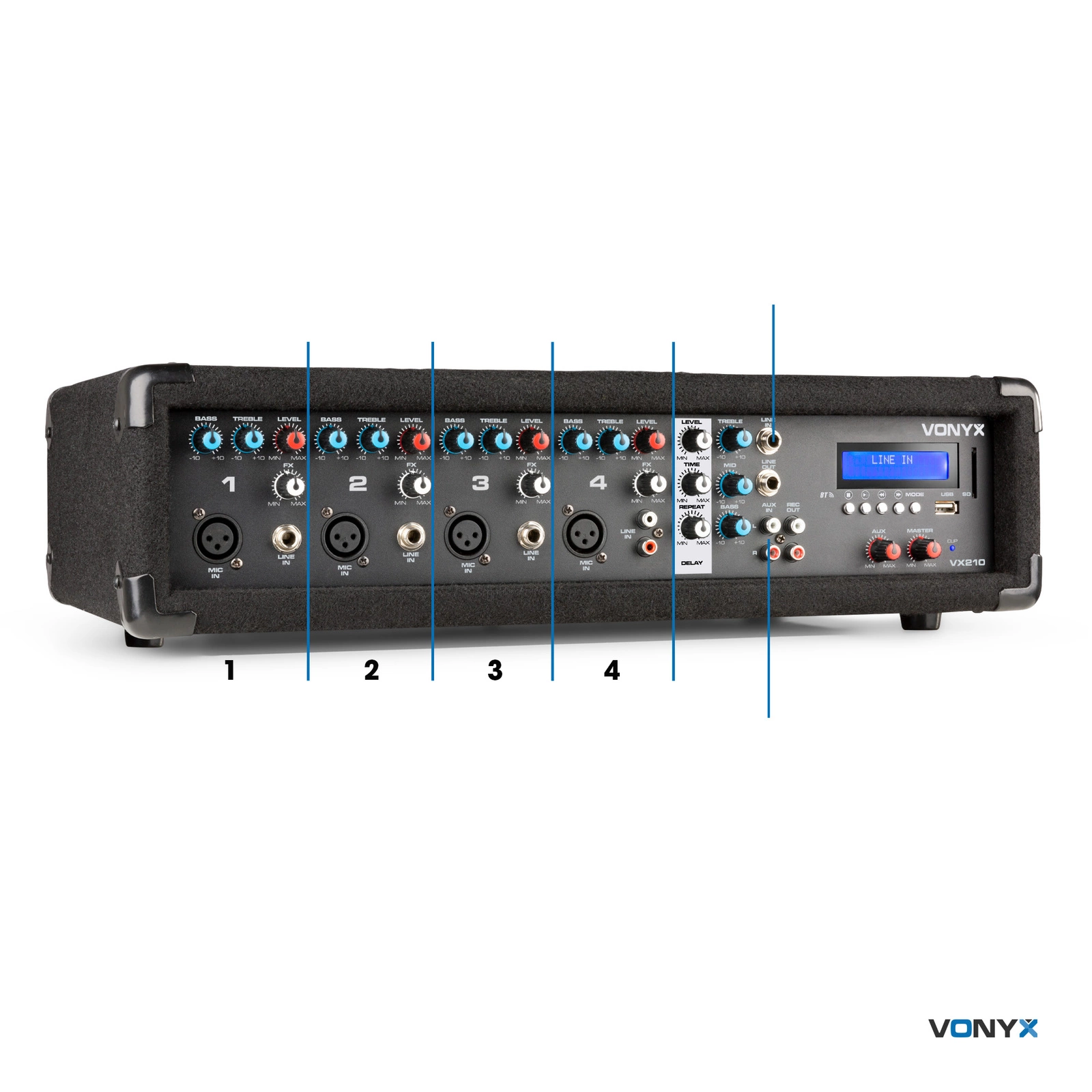 Vonyx VX210 jest wyposażony w 4-kanałowy mikser z wbudowanym wzmacniaczem. Ten aktywny mikser dostarcza łącznie 1000 watów mocy, specjalnie dostrojonych do dwóch kolumn o mocy 500W. Dzięki tak potężnej mocy możesz być pewien, że całe pomieszczenie będzie cieszyć się imponującym dźwiękiem.