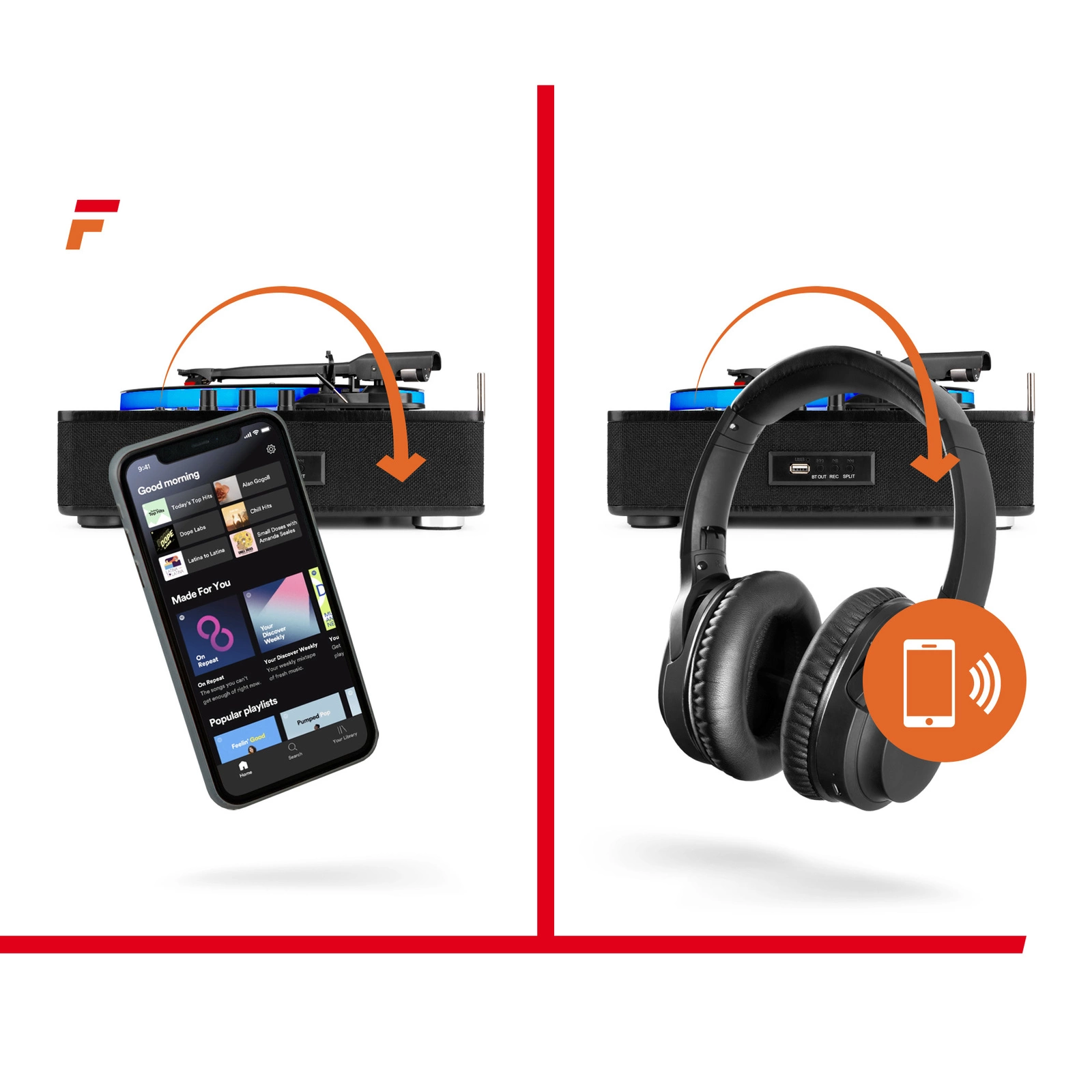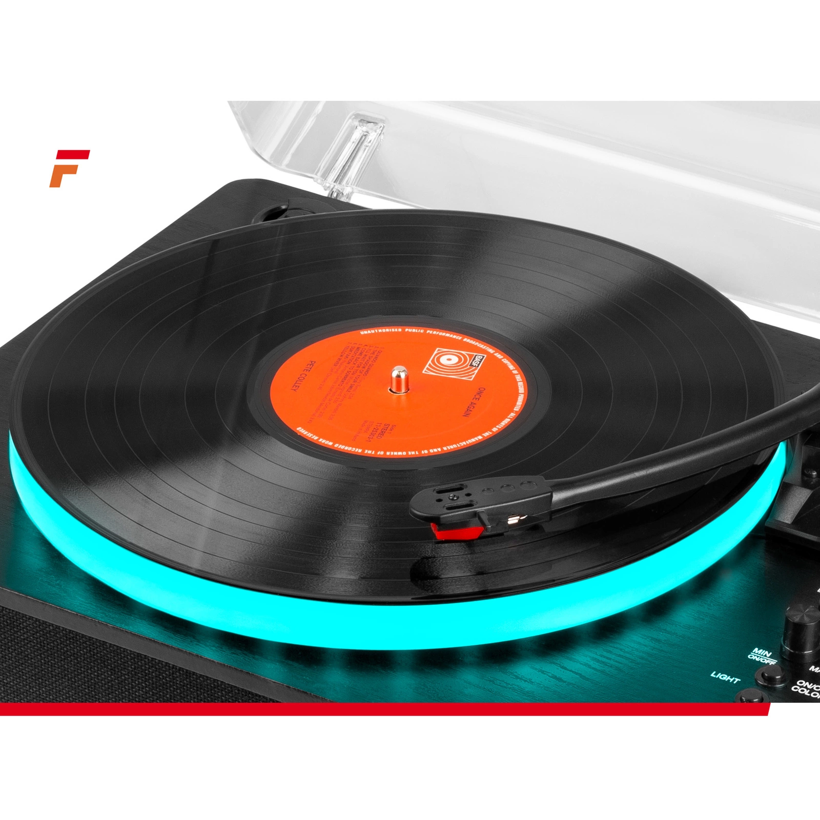 - Wysokiej jakości gramofon ze zmieniającymi kolor diodami LED