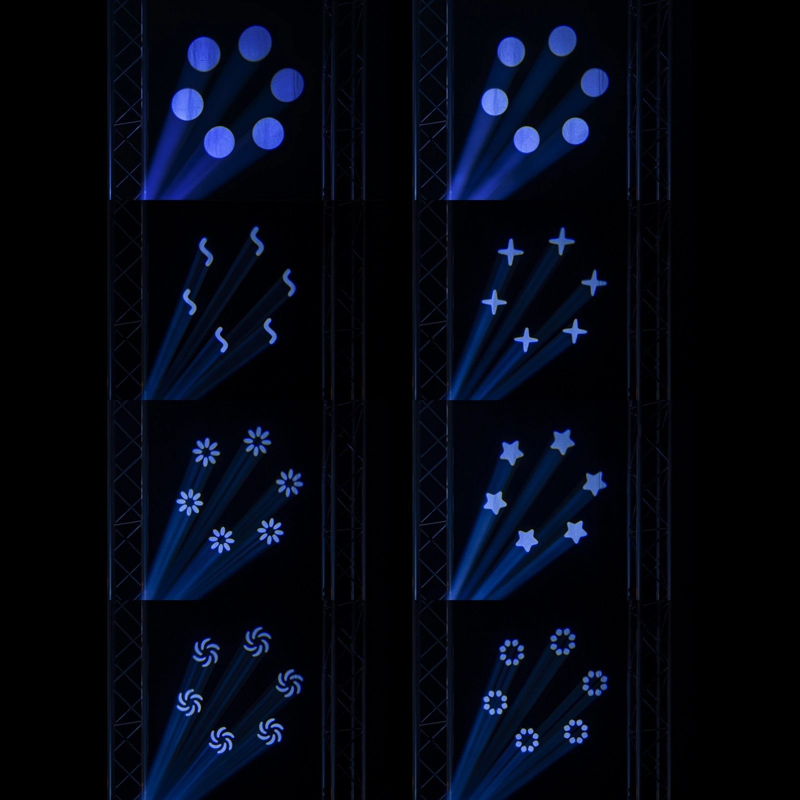 - Tarcza Gobo: 7 stałych gobo + otwarte