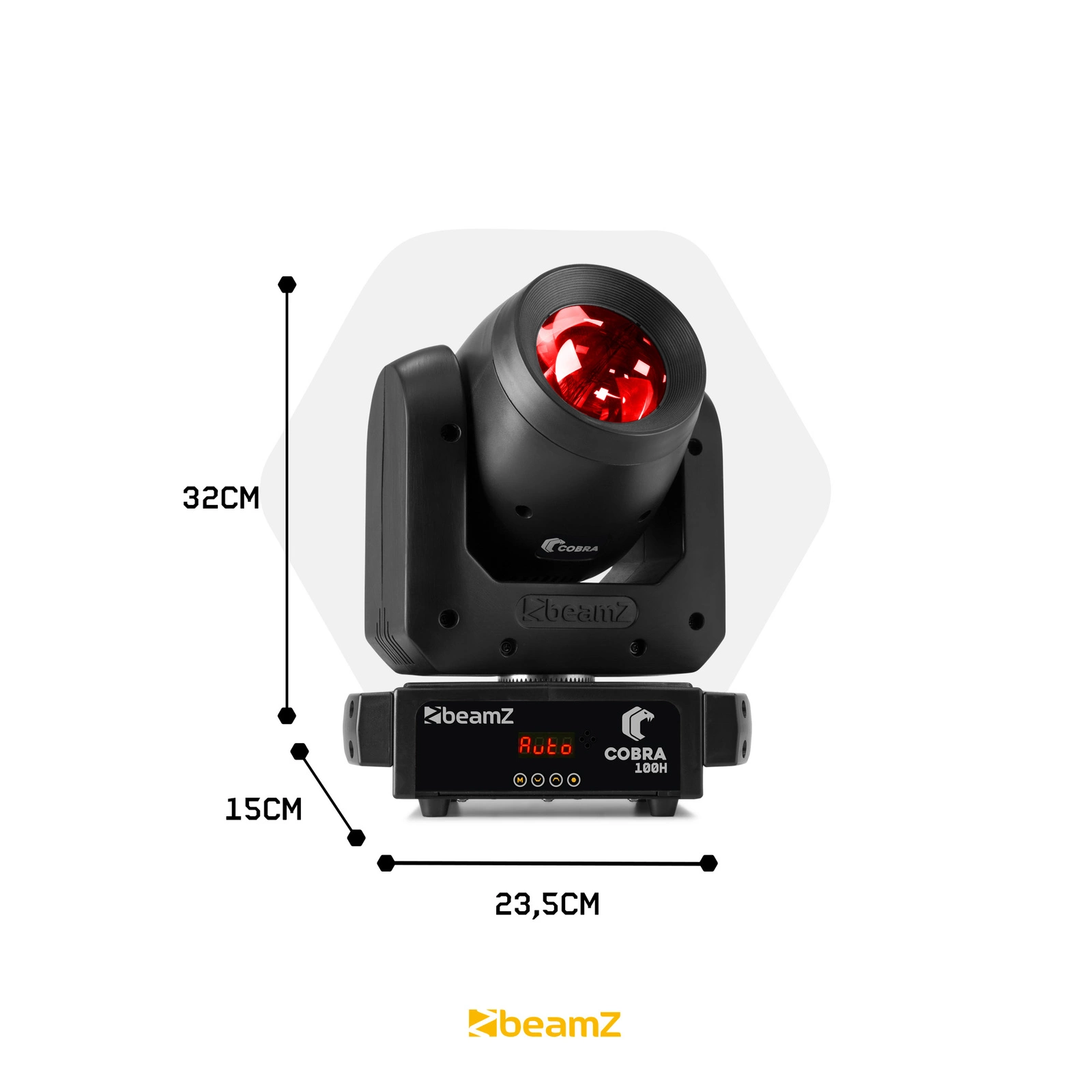BeamZ Cobra 100H jest wyposażona w mocną 100W lampę LED. Koło kolorów RGB umożliwia mieszanie i wyświetlanie wielu kolorów. Model ten posiada również tarczę gobo z 7 stałymi gobo. Dzięki temu można wyświetlać różne figury. Funkcja wstrząsania gobo daje możliwość wprawiania figur w ruch (wstrząsanie). Opcjonalny efekt pryzmatu zapewnia rozbicie wiązki światła na wiele wiązek światła, które można również obracać. Dzięki tym wszystkim funkcjom masz gwarancję imponującego pokazu świetlnego.