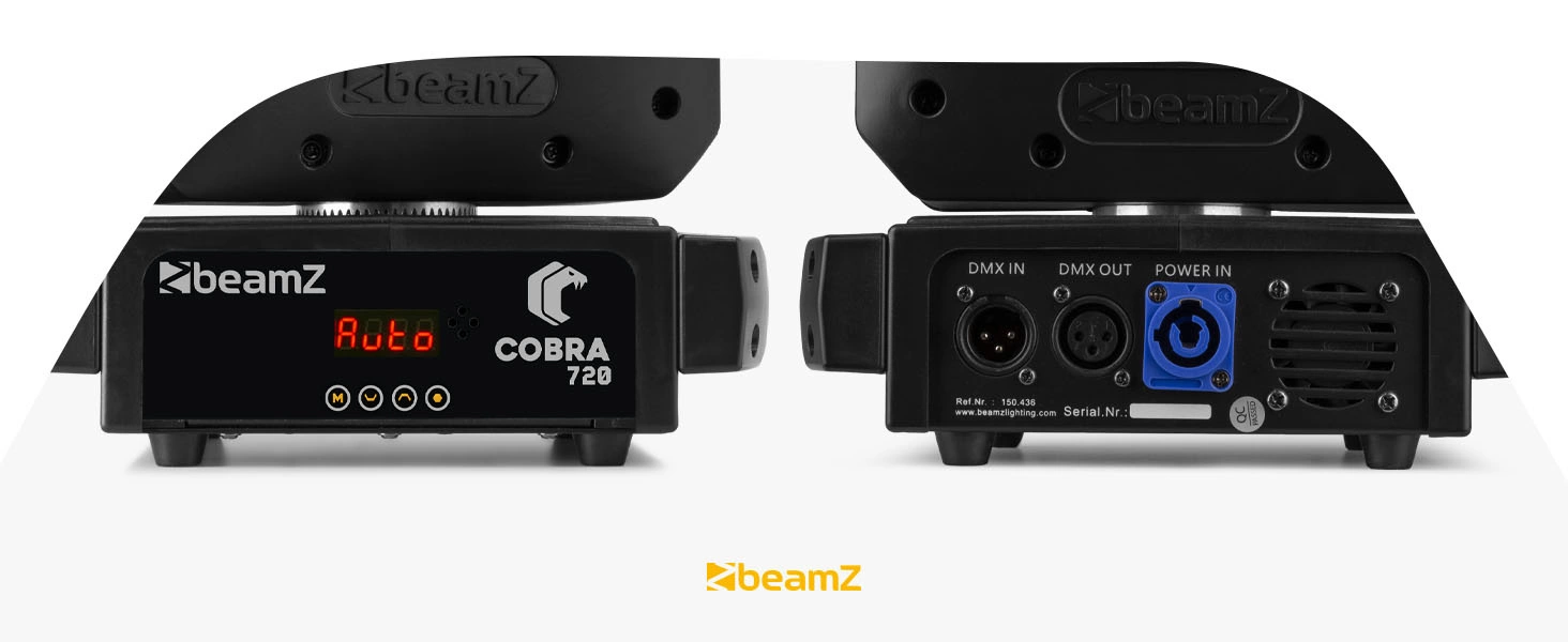 Seria Cobra 720 oferuje pełną kontrolę dzięki różnym trybom sterowania. Na przykład możesz sterować tą ruchomą głową za pomocą DMX. Masz także możliwość skorzystania z jednego z zaprogramowanych pokazów. Dodatkowo model ten posiada tryb automatyczny oraz tryb sterowany dźwiękiem. To sprawia, że Cobra 720 jest wszechstronna. Zarówno jako część większych pokazów świetlnych, jak i samodzielnie.