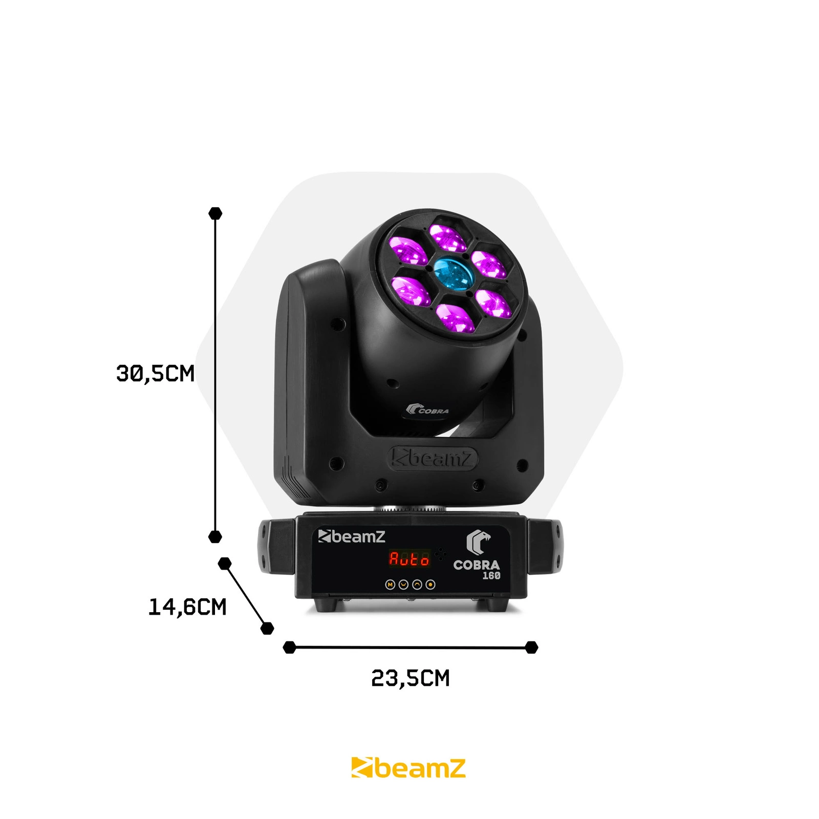 Efekt B-eye wyróżnia te ruchome głowy na tle wielu zwykłych modeli wash/spot. BeamZ Cobra160 ma wiele diod LED, którymi można sterować indywidualnie. Te ruchome głowice posiadają doskonałą funkcję zoomu, która umożliwia regulację wiązki światła od bardzo szerokiej do bardzo wąskiej. Dodatkowo model ten oferuje możliwość obracania samych soczewek. Tworzy to dynamiczne, spiralne lub kwiatowe wzory, które mogą zmieniać zarówno kolor, jak i kształt.