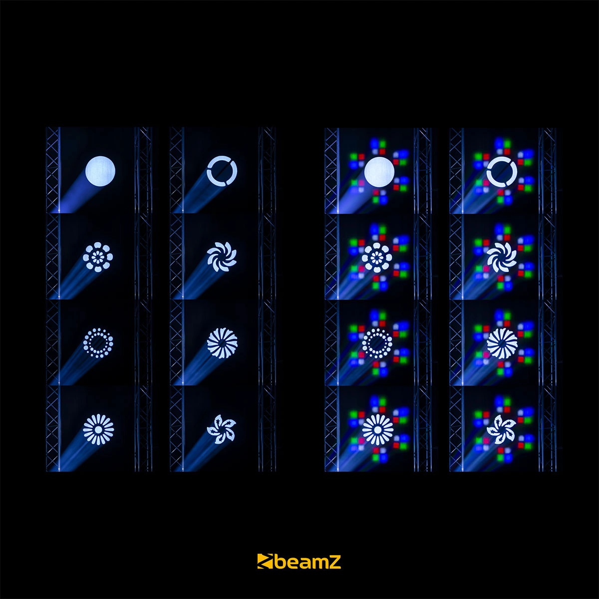 Oprócz wyżej wymienionych funkcji, ta ruchoma głowica posiada tarczę gobo z 7 stałymi gobo dla wiązki 100-watowej diody LED o wysokiej intensywności umieszczonej pośrodku. Dodatkowo model ten posiada funkcję potrząsania gobo, dzięki której można szybko potrząsać efektem gobo tam i z powrotem. A jeśli chcesz, aby był to prawdziwy spektakl, użyj funkcji tęczy, aby uzyskać spektakl w prawdziwych kolorach.