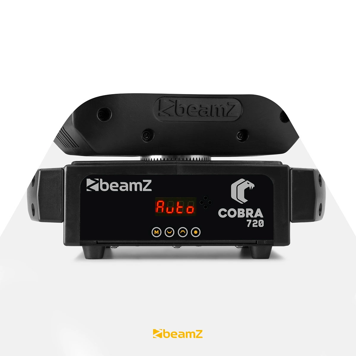 Seria Cobra 720 oferuje pełną kontrolę dzięki różnym trybom sterowania. Na przykład możesz sterować tą ruchomą głową za pomocą DMX. Masz także możliwość skorzystania z jednego z zaprogramowanych pokazów. Dodatkowo model ten posiada tryb automatyczny oraz tryb sterowany dźwiękiem. To sprawia, że Cobra 720 jest wszechstronna. Zarówno jako część większych pokazów świetlnych, jak i samodzielnie.