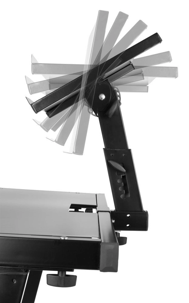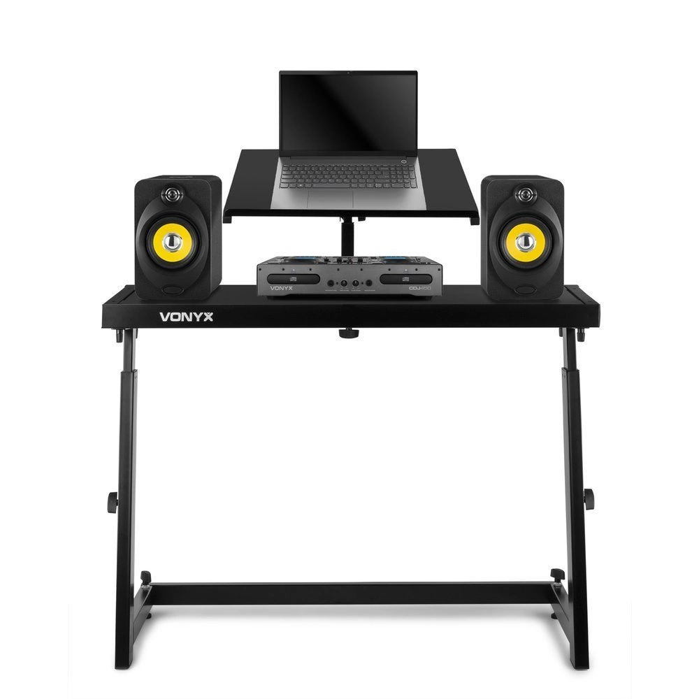 Statyw z pulpitem: Statyw z pulpitem zapewnia stabilne podparcie dla sprzętu DJ-a, na którym można umieścić kontroler, mikser lub inne urządzenia audio. Dzięki regulowanej wysokości można dostosować ustawienie do preferencji użytkownika oraz warunków przestrzeni.