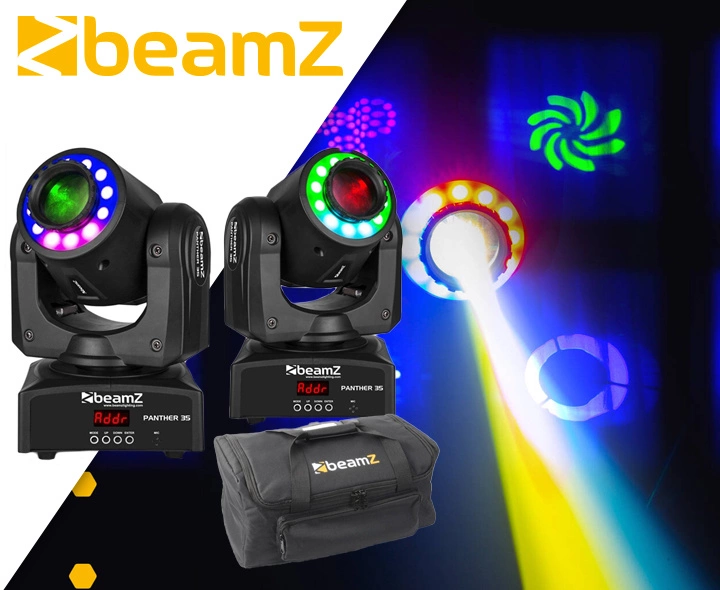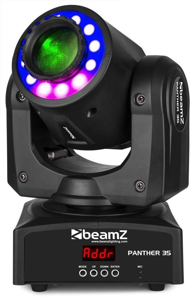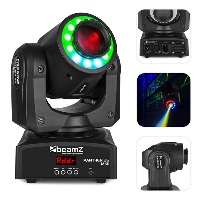Panther 35 jest wyposażony w pierścień LED wokół obiektywu dla dodatkowego efektu. Ten pierścień LED jest podzielony na 4 sekcje po 3 diody LED, gdzie każdą sekcją można sterować oddzielnie. Dzięki mieszance kolorów RGB (Red, Green, Blue) może przybierać wiele kolorów. Koło kolorów ruchomej głowy Panther 35 ma 7 kolorów + otwarte. Efekt tęczy i przepływu umożliwia tworzenie pięknych zmian kolorów w barwnym pokazie świetlnym. Tarcza gobo wyposażona jest w 7 gobo (figurek) + otwarte. Koło gobo ma również efekt przepływu i jest wyposażone w efekt wstrząsania. Dzięki połączeniu efektów tarczy kolorowej i tarczy gobo możliwe są bardzo piękne i różnorodne pokazy świetlne.