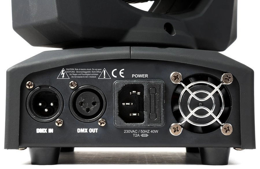 można wybrać DMX. Przy 5, 9 lub 11 kanałach stopień kontroli można ustawić według potrzeb. W trybie 11- kanałowym ruchoma głowa może być w pełni obsługiwana aby wykorzystać wspaniały efekt. Panther 40 można również sterować dźwiękiem, wbudowany mikrofon aktywuje następnie ruchomą głowę, która sama kontroluje ruch, kolory, gobo itp. Jeśli nie słychać dźwięku, możesz również wybrać tryb automatyczny, dzięki któremu ruchoma głowica działa całkowicie niezależnie.