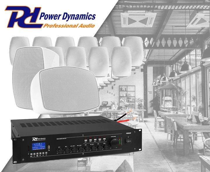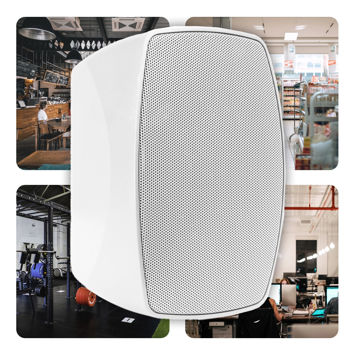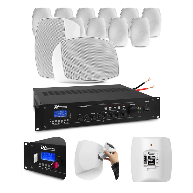 System głośników naściennych w technologii 100V. Ten 360 watowy system wyposażany w głośniki o wysokiej odporności, nadaję się do użytku jako komercyjny system audio do emisji muzyki w tle. Jest idealnym rozwiązaniem dla wszystkich komercyjnych zastosowań w miejscach takich jak restauracje, bary, puby, kawiarnie, sklepy, magazyny, siłownie i sale fitness