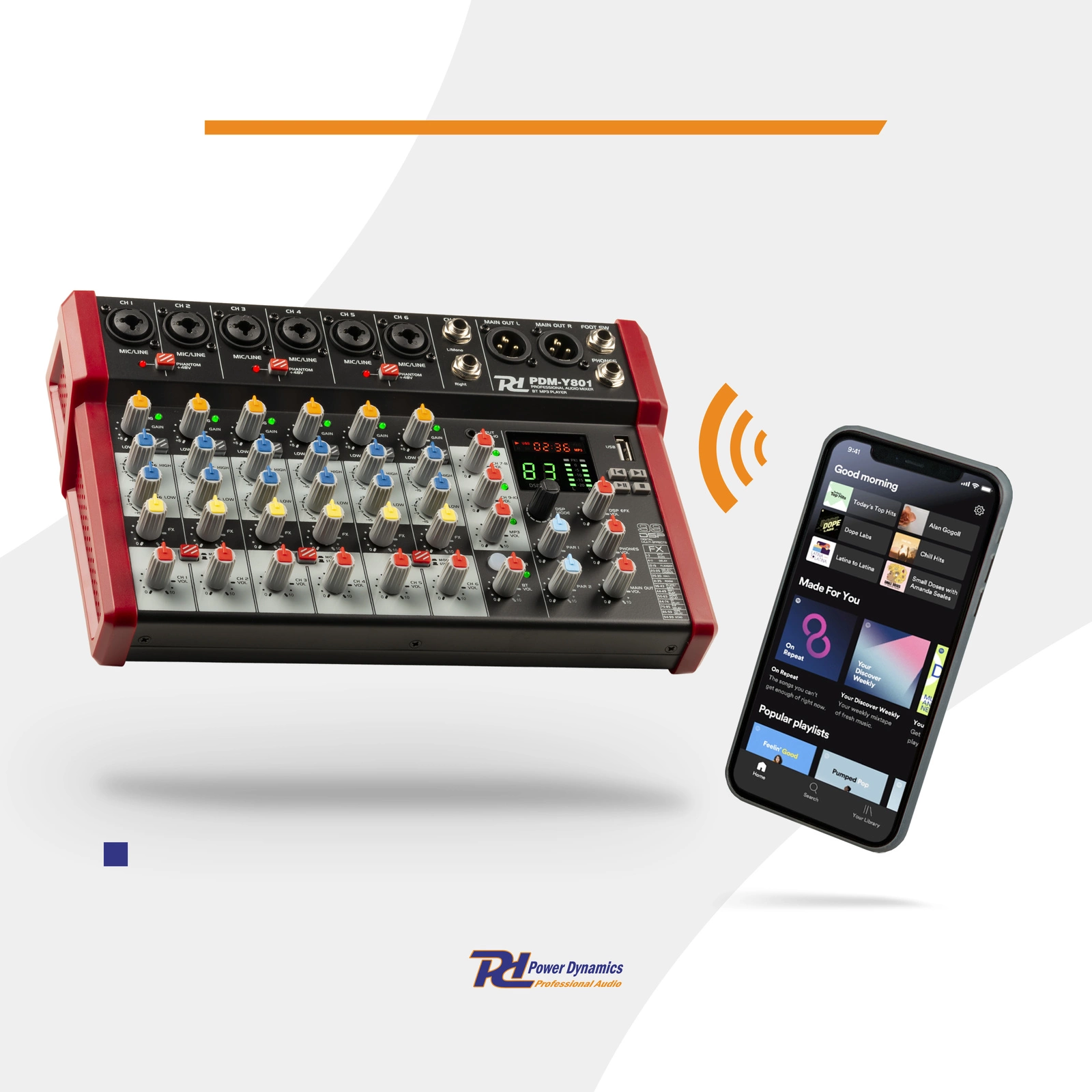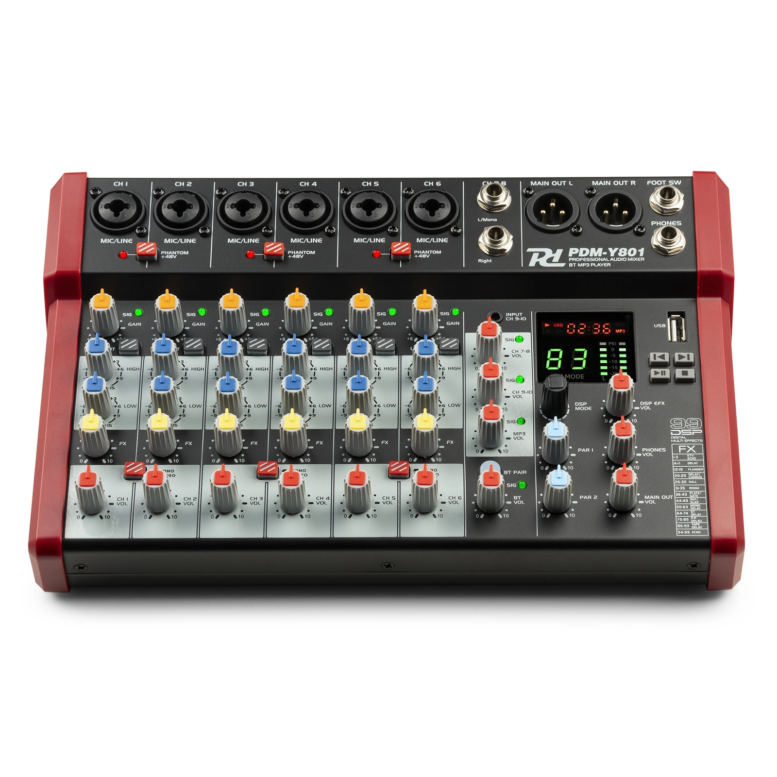 Pod względem łączności, PDM-Y801 jest niezwykle wszechstronny. Mikser ten wyposażony jest w 6 kombinowanych wejść mikrofonowych (6,3 mm i XLR). Dzięki połączeniu telefonu, tabletu lub komputera z mikserem przez Bluetooth, problemy z kablami odchodzą w przeszłość. Możesz także odtwarzać pliki (mp3) za pomocą pendrive'a USB. Wejście AUX, które można podłączyć za pomocą kabla jack 3,5 mm, oferuje dodatkową opcję z możliwością osobnej regulacji głośności. Krótko mówiąc, masz wiele opcji do połączenia.