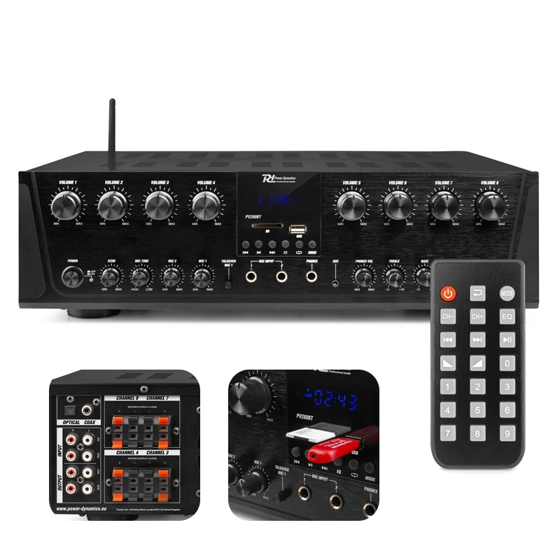 Dzięki wzmacniaczowi PD280BT firmy Power Dynamics, strumieniowanie muzyki z telefonu lub tabletu jest bardzo proste dzięki funkcji Bluetooth. Możesz samodzielnie wybrać, w której strefie muzyka ma być odtwarzana. PD280BT posiada także funkcję radia FM z zakresem częstotliwości od 87,5 MHz do 108 MHz, z możliwością automatycznego zapisywania stacji. Jest to bardzo wygodne, jeśli często słuchasz tej samej stacji radiowej. Ponadto wzmacniacz obsługuje odtwarzanie muzyki przez USB, kartę SD lub zewnętrzne urządzenia z wejściem jack 3,5 mm.