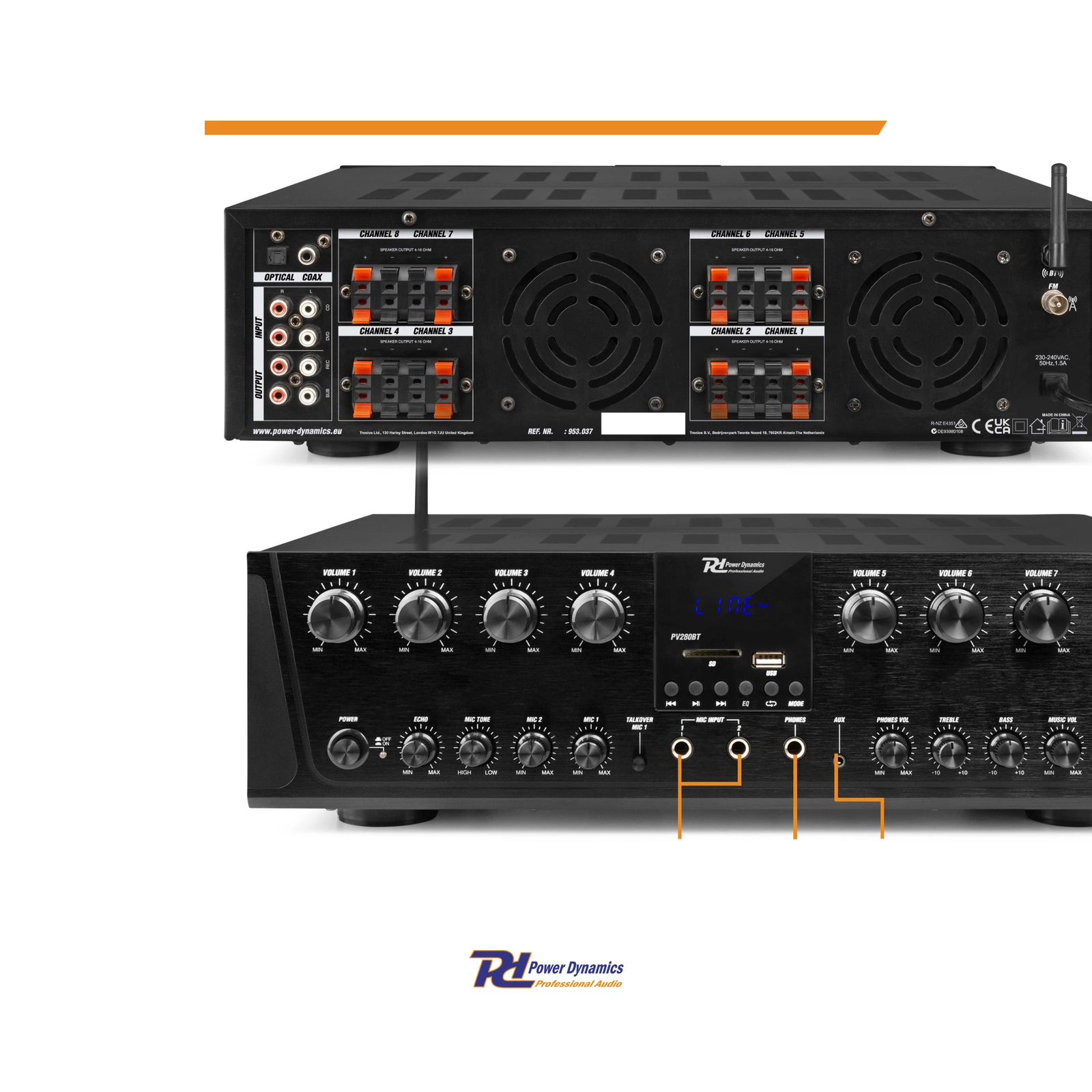 PV280BT od Power Dynamics to wszechstronny wzmacniacz obsługujący 8 stref, który umożliwia precyzyjne sterowanie poziomem dźwięku maksymalnie 16 głośników w 8 strefach. PV280BT dysponuje łączną mocą 800W, gdzie każde z 16 wyjść dostarcza 50W mocy. Dzięki regulowanym przyciskom Treble i Bass oraz różnym ustawieniom equalizera, takim jak Pop, Normal, Rock, Classic, Country i Jazz, możesz dostosować dźwięk do swoich preferencji. Wejście optyczne Toslink umożliwia podłączenie telewizorów, co sprawia, że wzmacniacz może być używany np. w siłowniach. Dodatkowo wzmacniacz jest idealnym rozwiązaniem dla restauracji, klubów i budynków użyteczności publicznej (z wieloma pomieszczeniami). Możesz podłączyć zarówno głośniki naścienne, jak i sufitowe lub ich kombinacje.