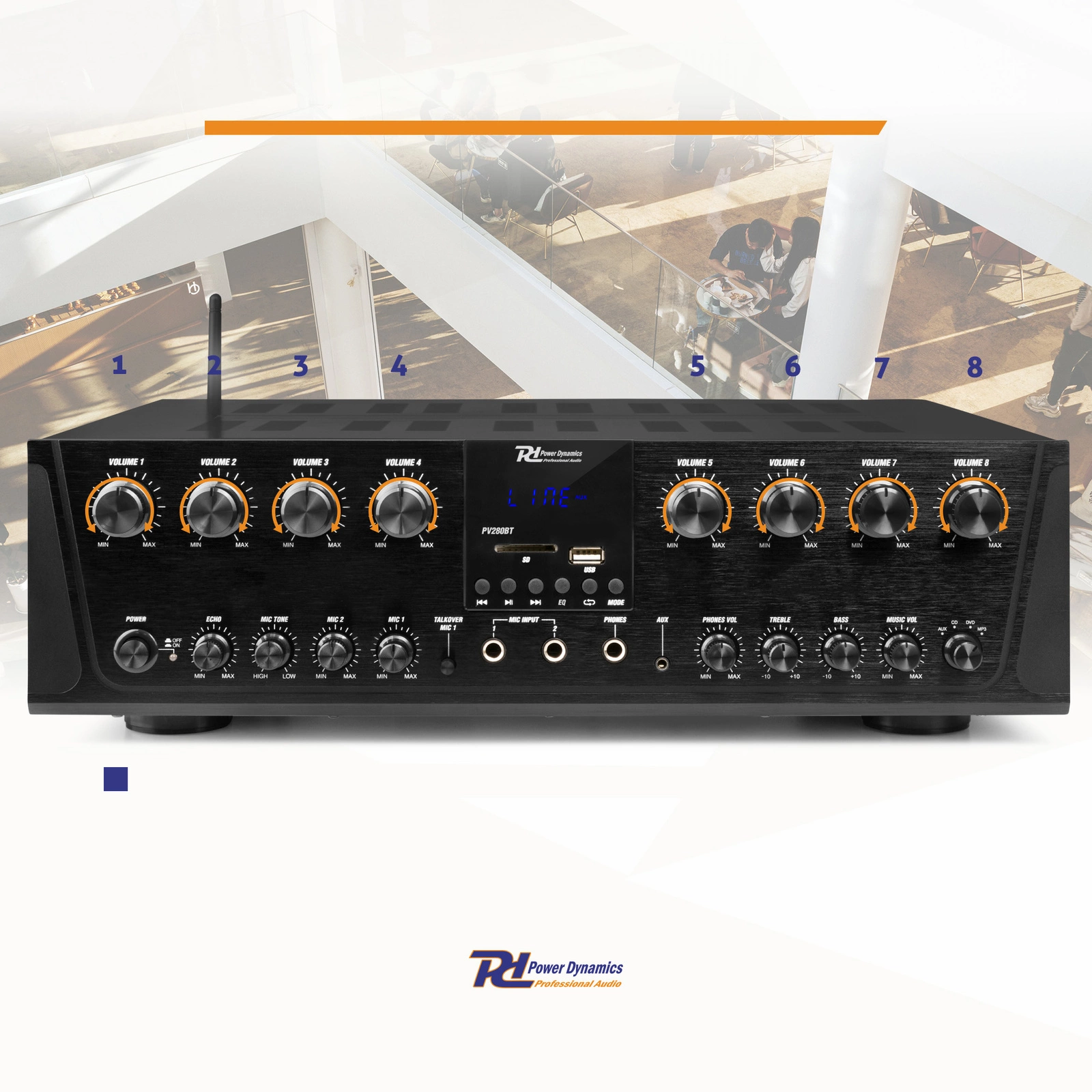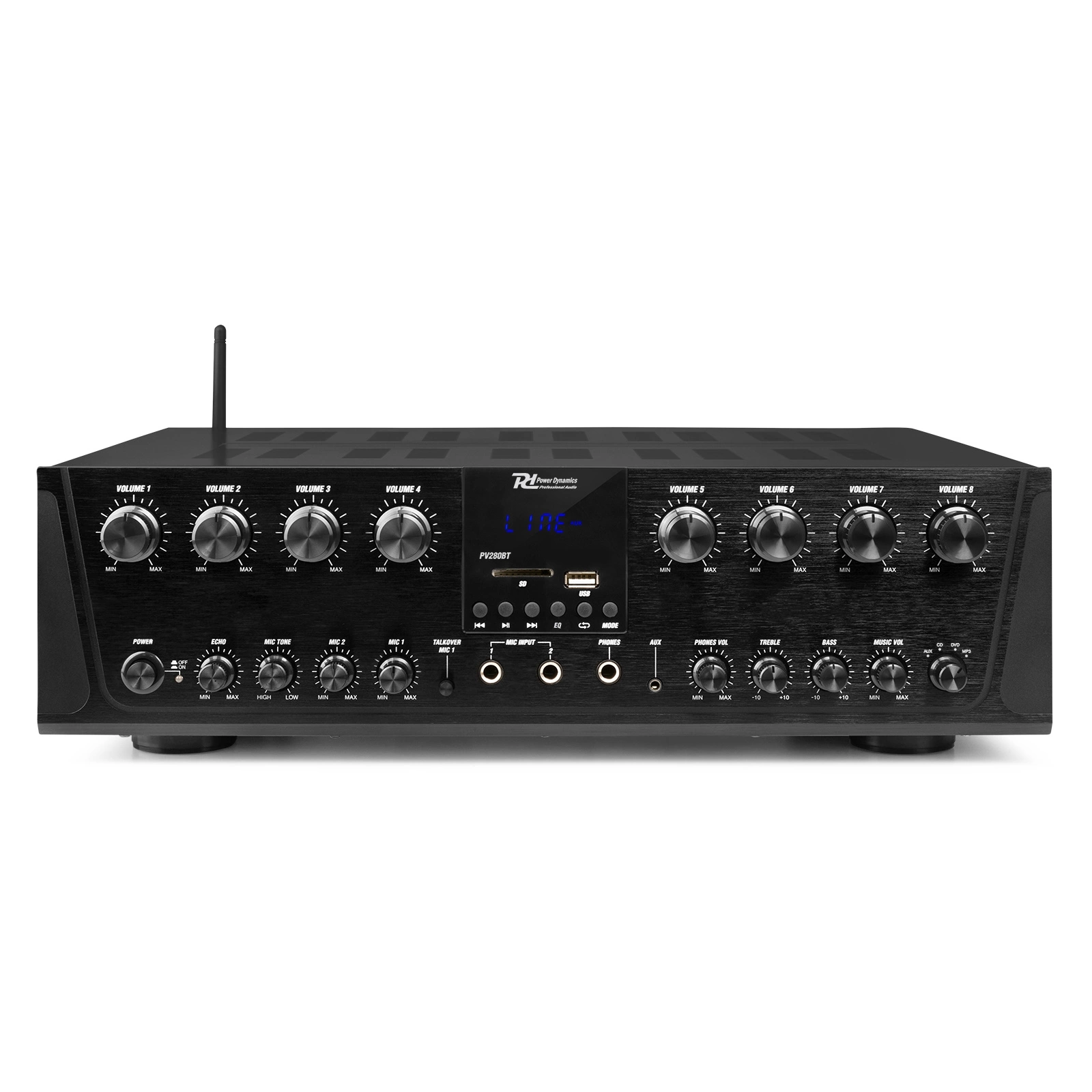 PV280BT jest wyposażony w dwa wejścia mikrofonowe, z opcjami efektu echa i trybu talkover. W trybie talkover muzyka jest automatycznie przyciszana, aby ogłoszenia były wyraźnie słyszalne, a za pomocą pokrętła „Mic Tone” możesz dostosować częstotliwości (wysokie/niskie) mikrofonu.