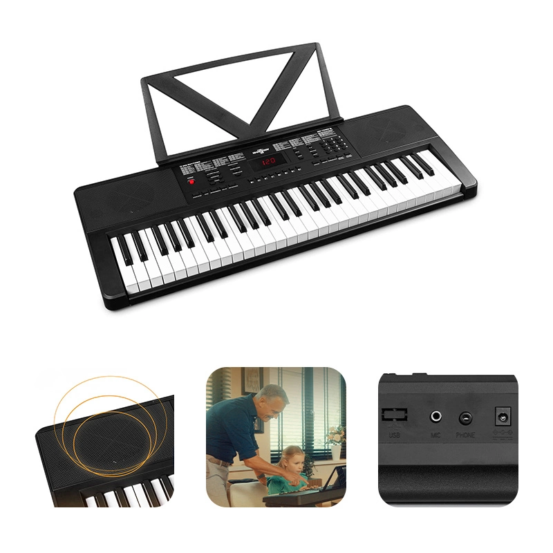 Rhapsody54 oferuje efekty takie jak sustain i vibrato, które urozmaicają dźwięki i dodają kreatywności do Twoich utworów. Możesz podzielić klawiaturę na dwie części, by grać wspólnie z inną osobą! Wbudowany metronom pomaga utrzymać rytm, a mikrofon pozwala śpiewać podczas gry. Na ekranie wyświetlają się wybrane dźwięki i rytmy, a specjalny uchwyt na nuty umożliwia wygodne korzystanie z partytur, tabletu lub telefonu z filmem z YouTube do nauki.