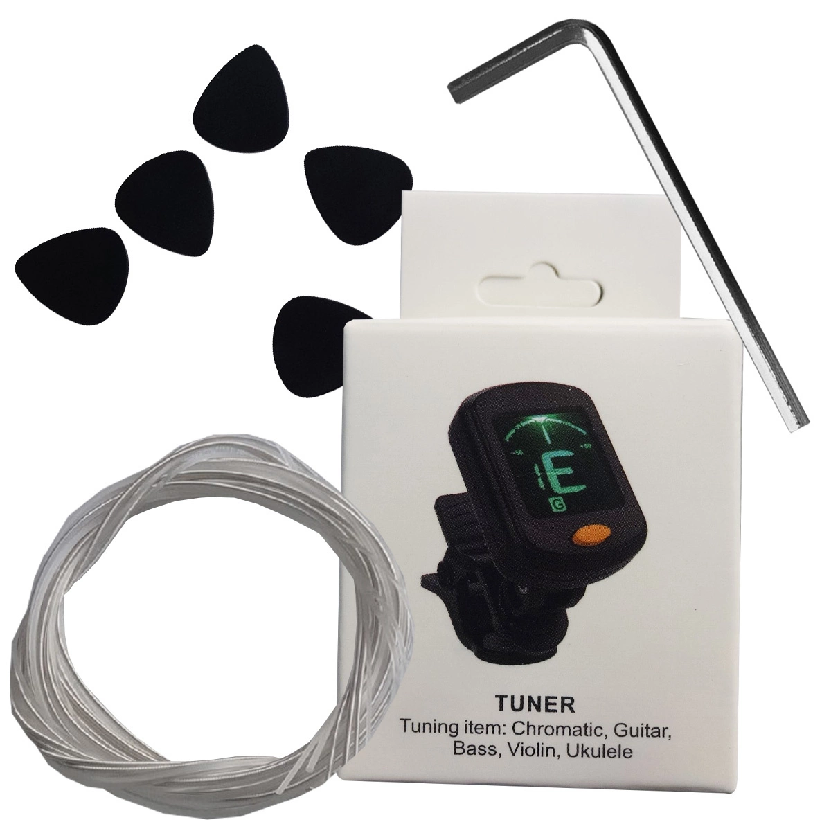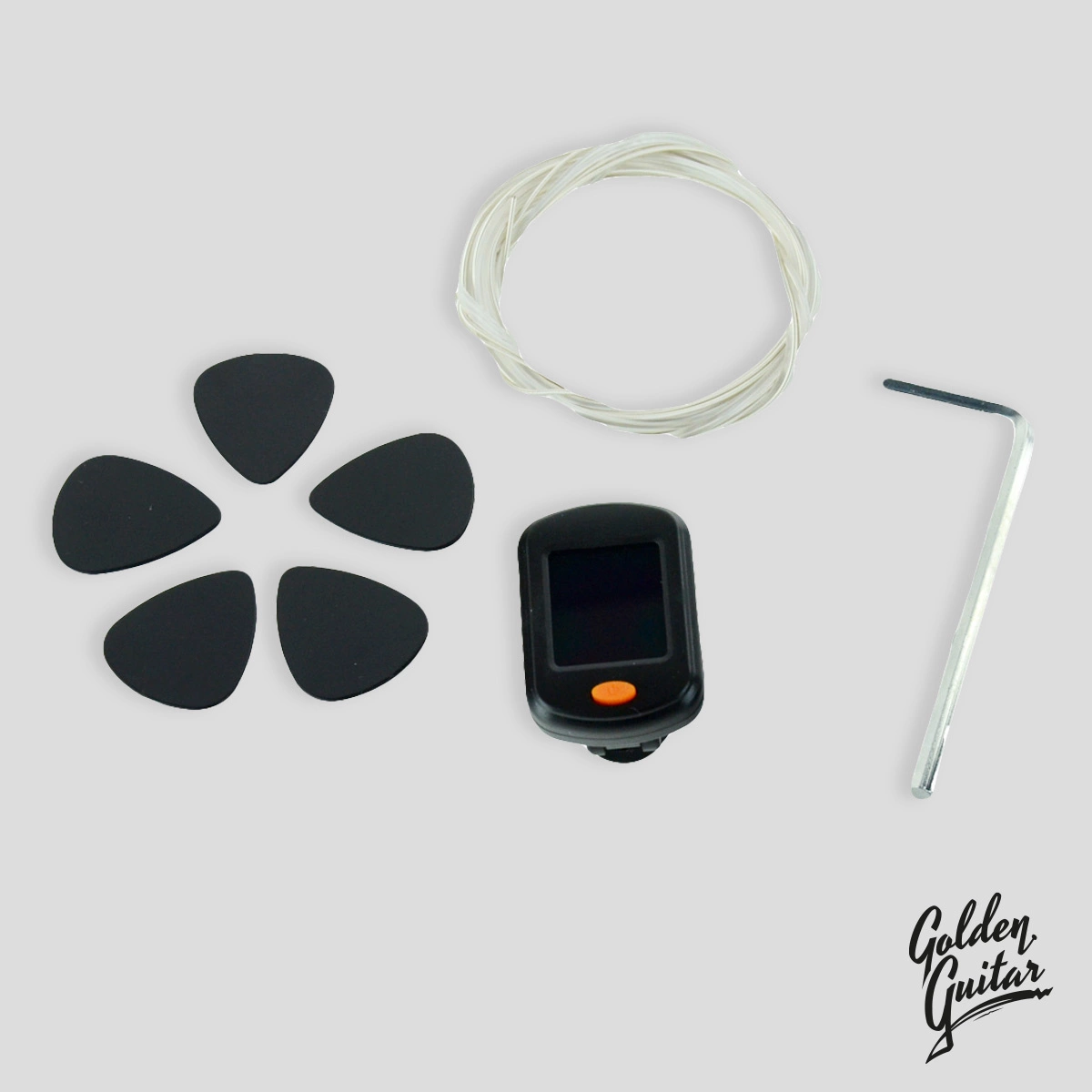 - W zestawie: pokrowiec, tuner, zapasowe struny oraz 5 kostek