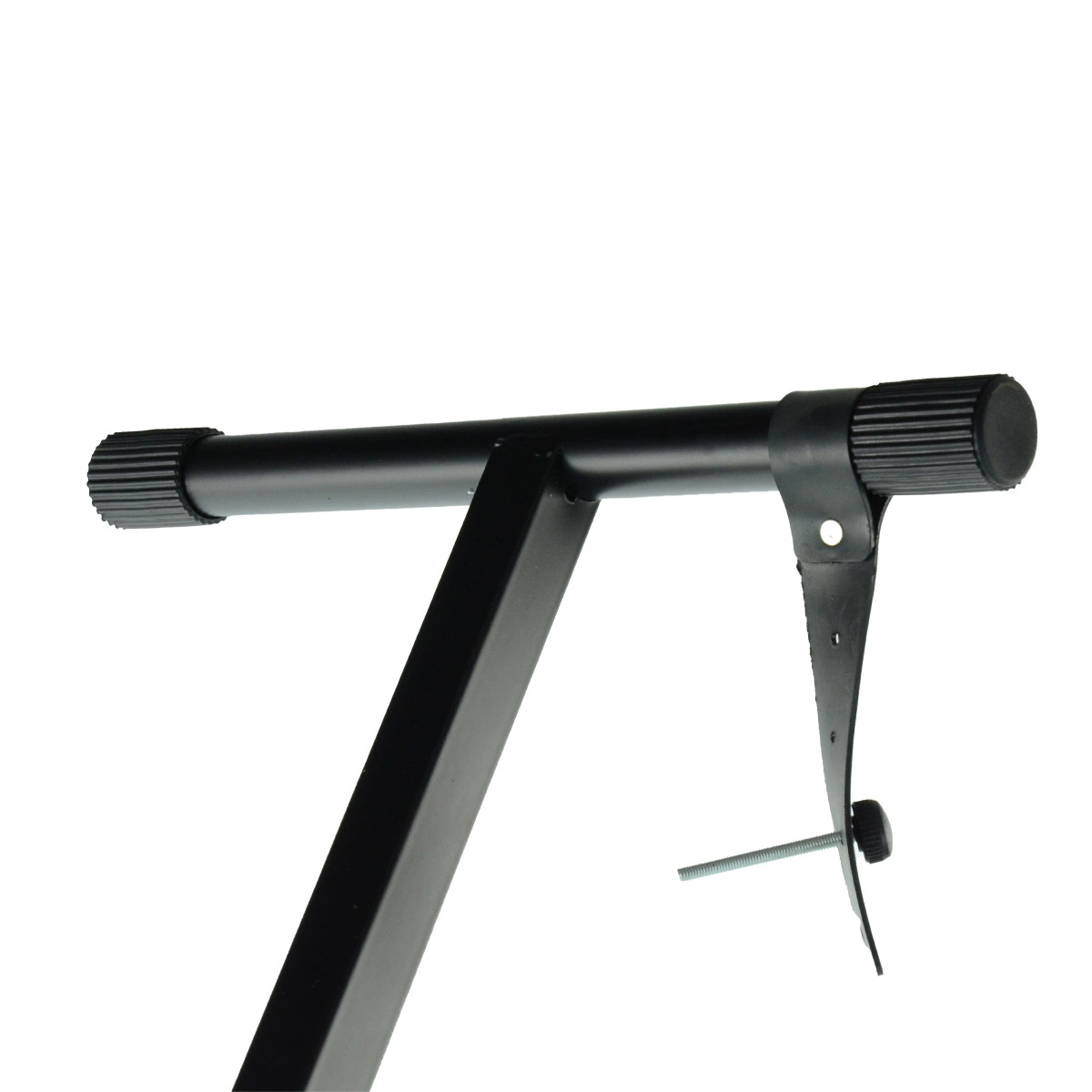- Antypoślizgowe zakończenia: Górne końce ramion, na których opiera się keyboard, są wyposażone w antypoślizgowe, gumowane elementy, które zwiększają przyczepność instrumentu i chronią go przed przesuwaniem się podczas gry. Dolne końce nóg również mają gumowe zakończenia, co dodatkowo stabilizuje statyw na podłożu i zapobiega jego przesuwaniu.