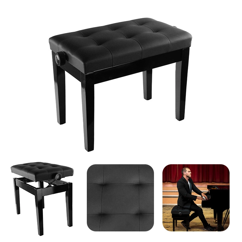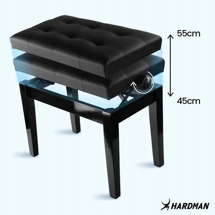- Regulowana wysokość siedziska za pomocą pokręteł po bokach: od 45 cm do 55 cm, co pozwala na dopasowanie wysokości do wzrostu pianisty.