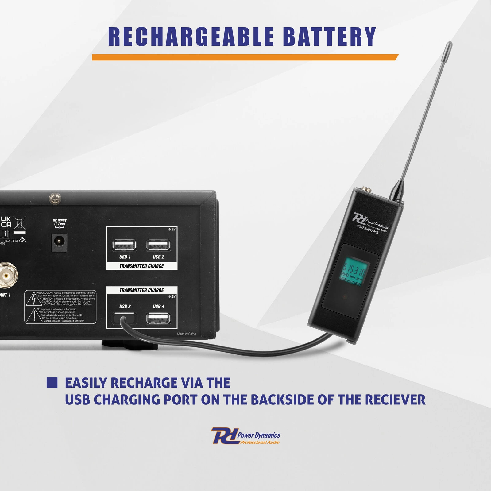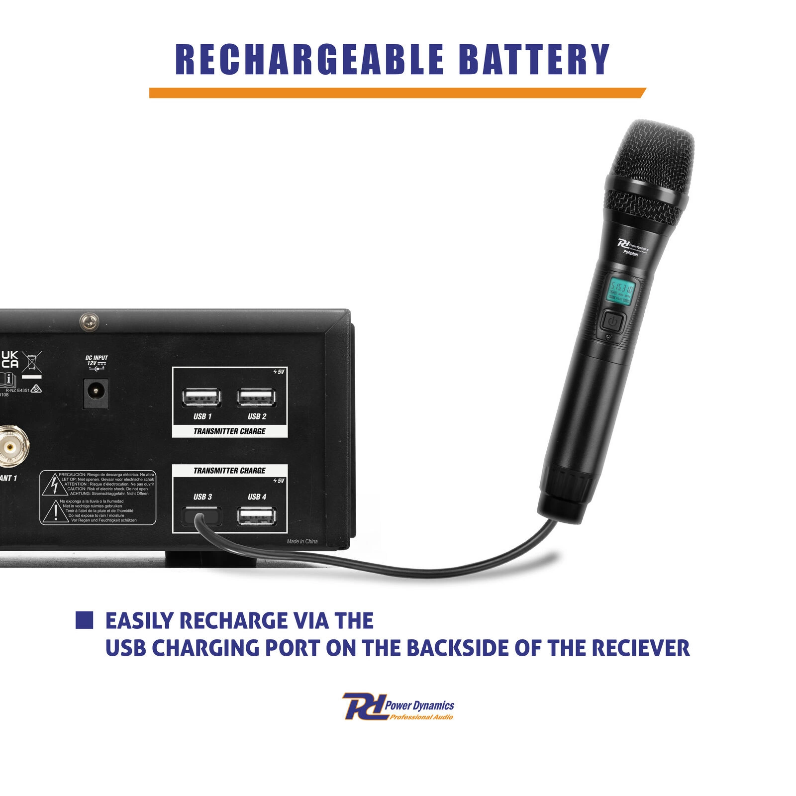 System mikrofonowy Power Dynamics PD528 jest wyposażony w wydajne ogniwa litowo-jonowe 18650, które zapewniają długotrwałe użytkowanie. Dzięki pojemności 3,7 V, mikrofony oferują stabilne zasilanie przez wiele godzin, co pozwala na nieprzerwane korzystanie podczas wydarzeń bez obaw o wymianę baterii w trakcie występu. Wbudowany zasilacz USB ułatwia ładowanie akumulatorów, co czyni system praktycznym i gotowym do użycia w każdej sytuacji.