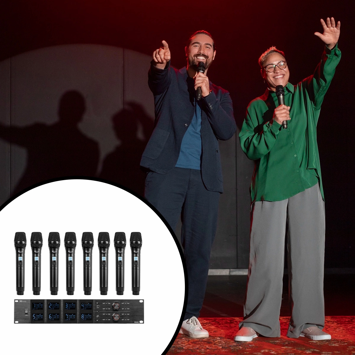 - 8 mikrofonów ręcznych z dynamicznym wyświetlaczem LCD i funkcją wyciszenia