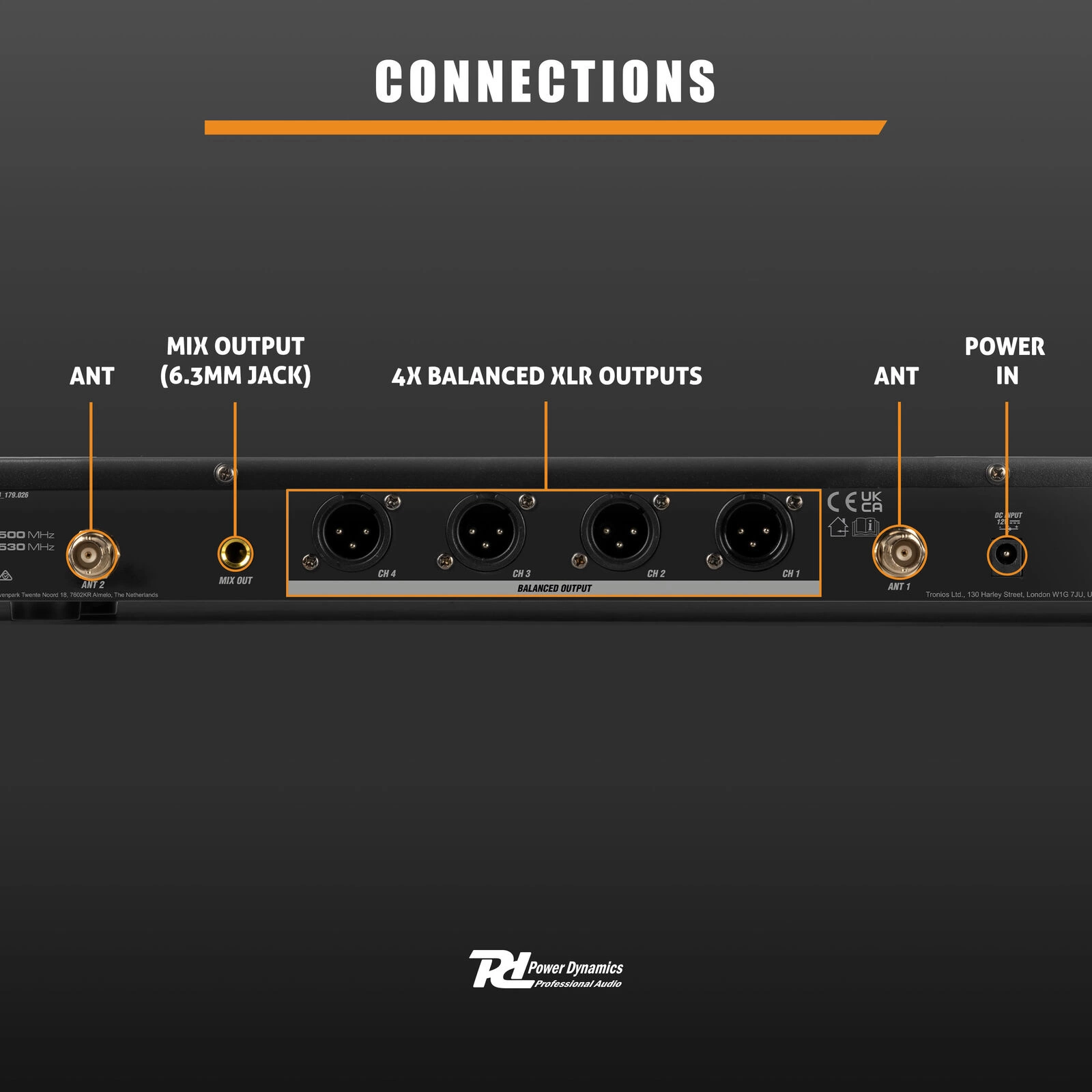 PD524B oferuje szereg wejść i wyjść, które zwiększają elastyczność użytkowania. Z tyłu odbiornika znajdują się 4 zbalansowane wyjścia XLR, umożliwiające przesyłanie każdego mikrofonu do miksera lub systemu audio, co jest szczególnie przydatne w większych konfiguracjach. Dodatkowe wyjście jack MIX 6,3 mm pozwala na szybkie podłączenie wszystkich mikrofonów do jednego złącza, co ułatwia obsługę w trakcie wydarzeń. Dzięki możliwości zasilania przez standardowy zasilacz AC (100–240 V), system jest nie tylko wszechstronny, ale także gotowy do pracy w różnych warunkach, co czyni go idealnym rozwiązaniem dla profesjonalnych użytkowników.