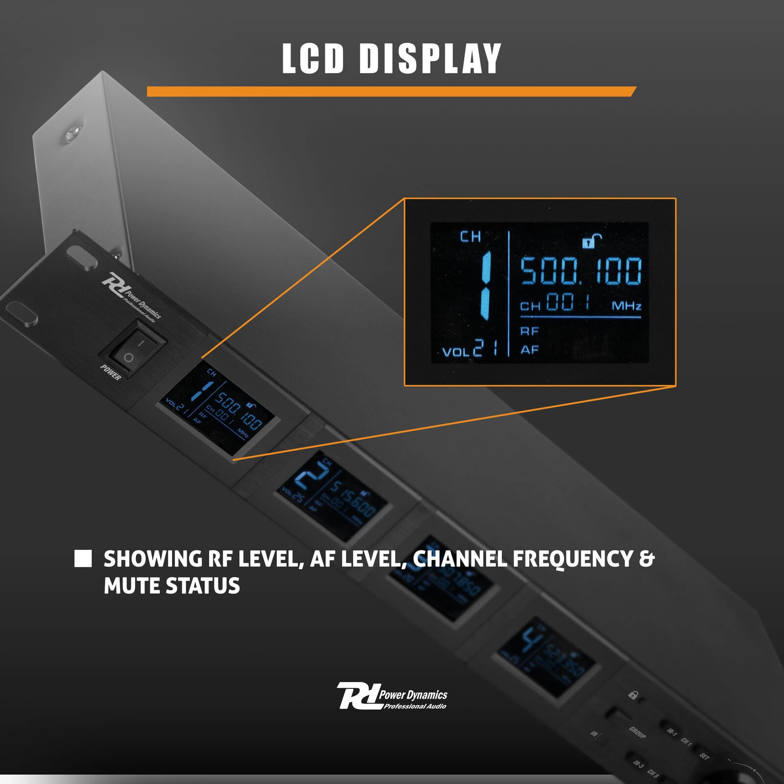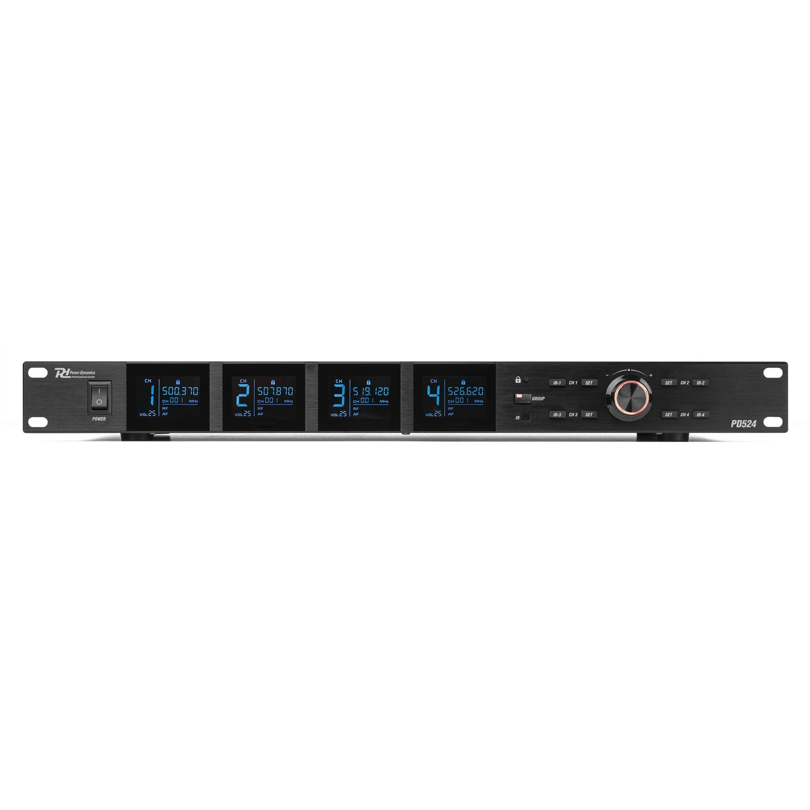 Odbiornik PD524B jest wyposażony w 4 oddzielne wyświetlacze LCD, które umożliwiają łatwe monitorowanie częstotliwości i ustawień każdego mikrofonu. Użytkownicy mogą regulować głośność mikrofonów bezpośrednio na odbiorniku, a zastosowane kodowanie kolorami eliminuje ryzyko przypadkowej regulacji niewłaściwego mikrofonu. Odbiornik oferuje 4 zbalansowane wyjścia XLR, co pozwala na przesyłanie sygnału do miksera lub systemu audio. Wyjście jack MIX 6,3 mm umożliwia podłączenie wszystkich mikrofonów jednym złączem, co znacząco zwiększa elastyczność użytkowania.