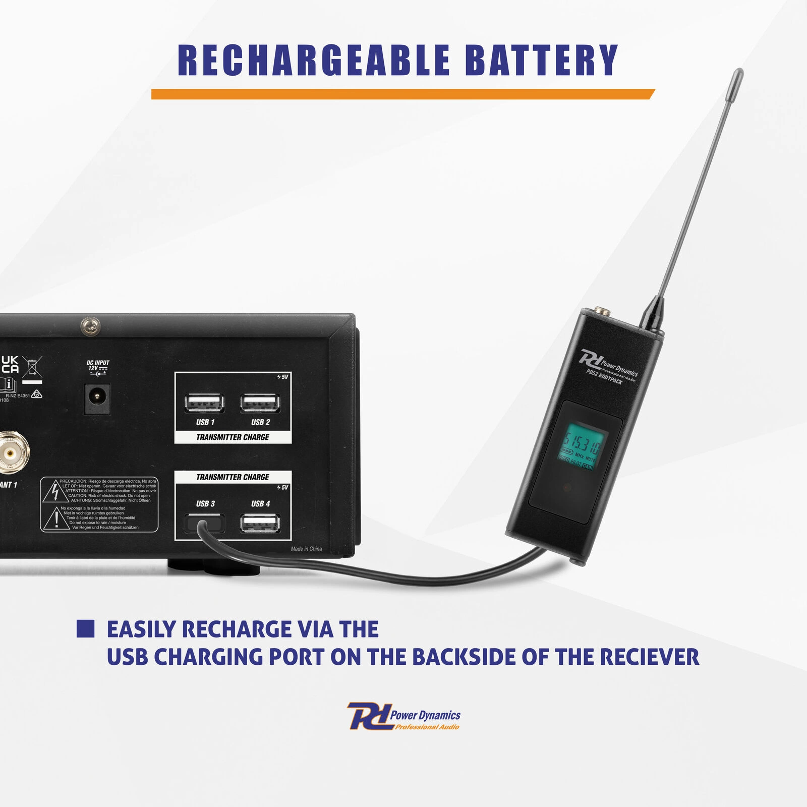 Mikrofony PD524B zasilane są przez ogniwa litowo-jonowe 18650 o napięciu 3,7 V, co zapewnia długotrwałe użytkowanie. Wbudowany zasilacz USB umożliwia szybkie ładowanie akumulatorów, eliminując konieczność częstej wymiany baterii. Dzięki temu system jest gotowy do pracy przez długi czas, co czyni go idealnym rozwiązaniem na długie wydarzenia i prezentacje.