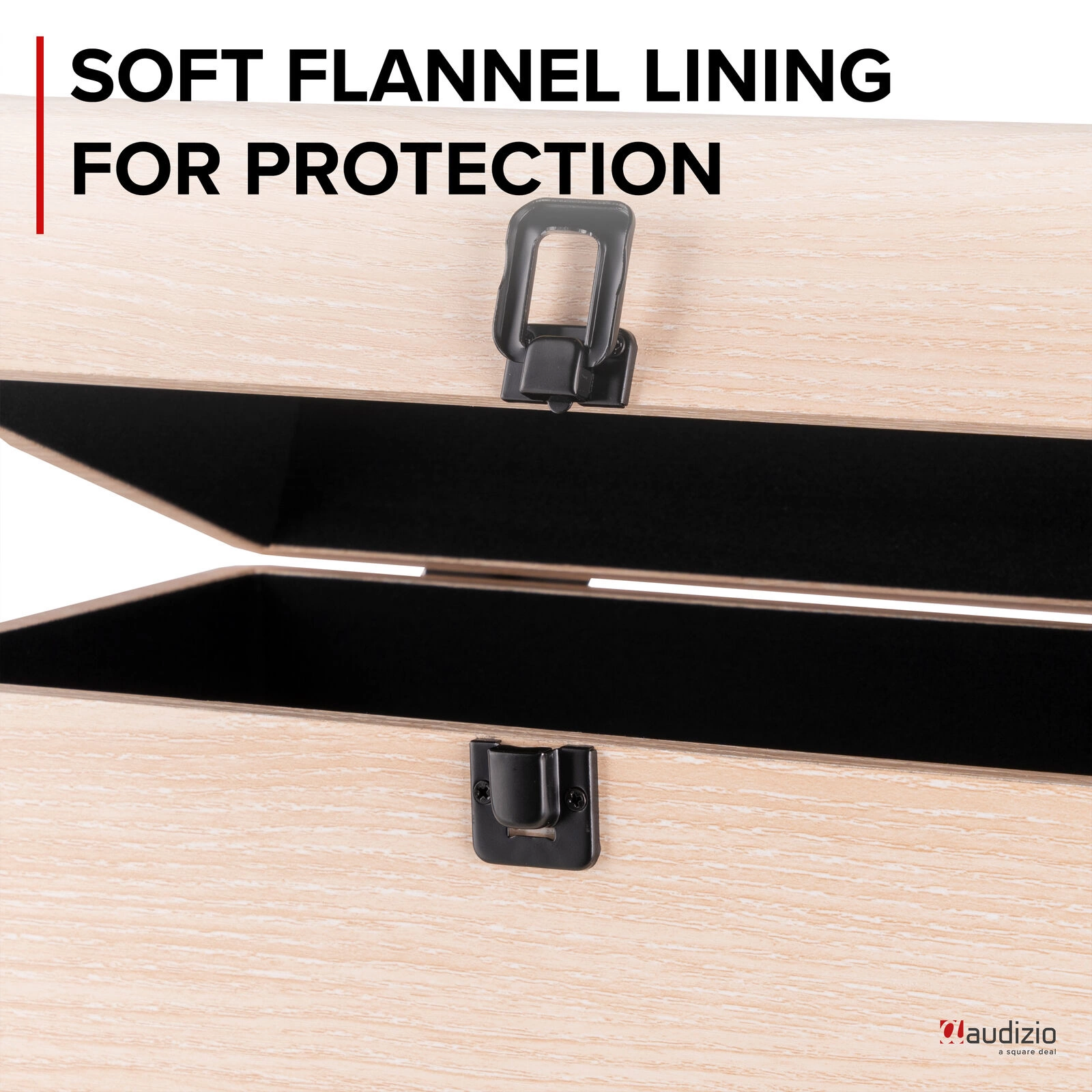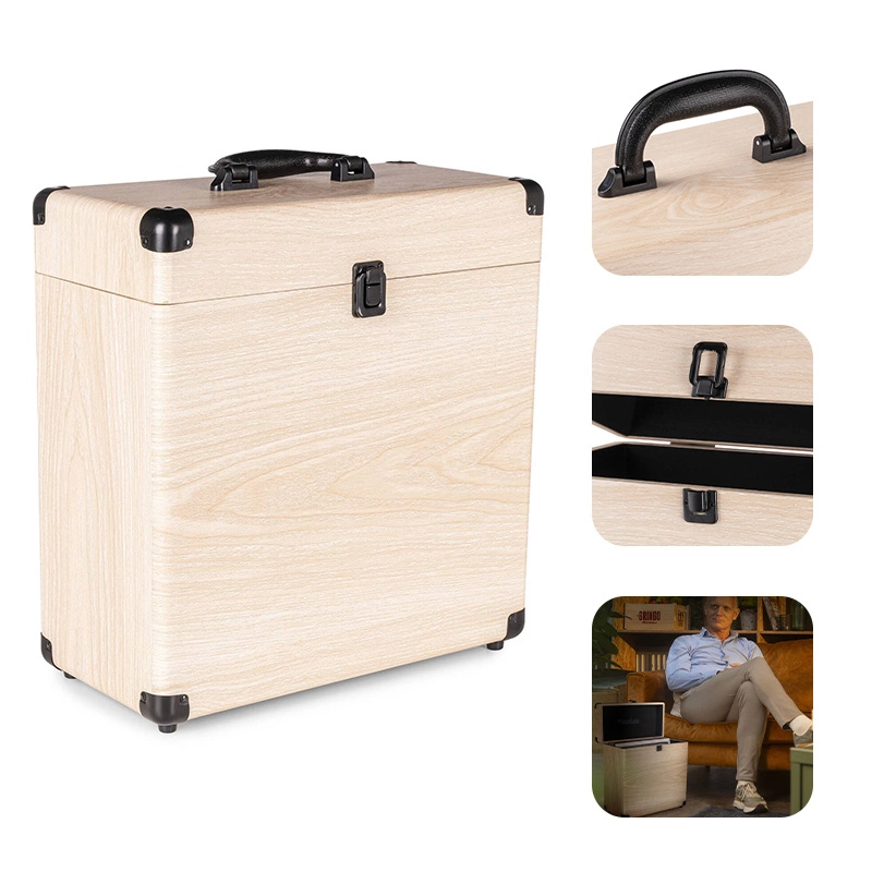 RC32 wyróżnia się eleganckim wyglądem, dzięki sztucznej skórze, która nadaje jej luksusowy charakter. Jasny drewniany kolor sprawia, że walizka jest nie tylko funkcjonalna, ale także stylowa, co czyni ją idealnym dodatkiem do każdego wnętrza. Doskonale komponuje się z gramofonami Audizio, podkreślając ich design.